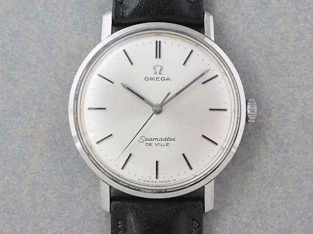 ・Movement:Cal.601(手巻き ・毎時 19800振動) ・Ser/Ref:25027035 / 135.020 ・Size:34.5mm ・Strap:18mm ブラック・カーフ(HIRSCH/Ascot) ・Age:1967年 ・Condition:〇・・・コンディション良好 (◎…デッドストックまたは未使用状態、〇…使用感程度のわずかな傷や汚れなど、△…多少の目立った傷などがあるが機能に影響がない、×…不具合あり) 在庫店舗:L o'clock"delve"(松原)https://shop.loclock.jp/p/00006 ◆シーマスターとデ・ビル、両方のモデル名が表記されたダブルネームの “OMEGA Seamaster DE-VILLE(オメガ・シーマスター・デ・ビル)” です。 「デ・ビル」はもともと「シーマスター」の一部として登場し、その後独立したコレクションへと展開されました。両モデル名が記されたWネームは流通数が少なく、ケースバックにシーマスターの証であるシーホースがしっかりと残り、デビルモデルらしいドレスよりなデザインで、双方の特徴が感じられます。 全体的に端正さが引き立つ良好なコンディションで、文字盤は針・インデックスともに光沢を保っています。ワンピースケースは小ぶりなケース径34.5mm、厚さも9mm弱と、ノンデイトの手巻きモデルならではのスッキリと腕元に収まるサイズ感です。 評価の高い自動巻きムーブメントCal.550系をベースに、自動巻き機構を外したCal.600の改良版であるCal.601を搭載し、洗練されたオメガの魅力が楽しめるモデルです。 ベルトは濃淡のある色合いのレザーにサドルステッチで伝統的に仕上げられたHIRSCH社製Ascotのブラックを取り付けました。 ◆ビンテージウオッチは全てオーバーホール及び部品交換等のメンテナンス済み、12ヶ月の作動保証付です。精度はテスター値で±30秒/日以内に調整しています。 ※使用状況等により多少の誤差が生じることがあります。 古物商許可:東京都公安委員会 第303261606122号 株式会社エルオクロック <3101>