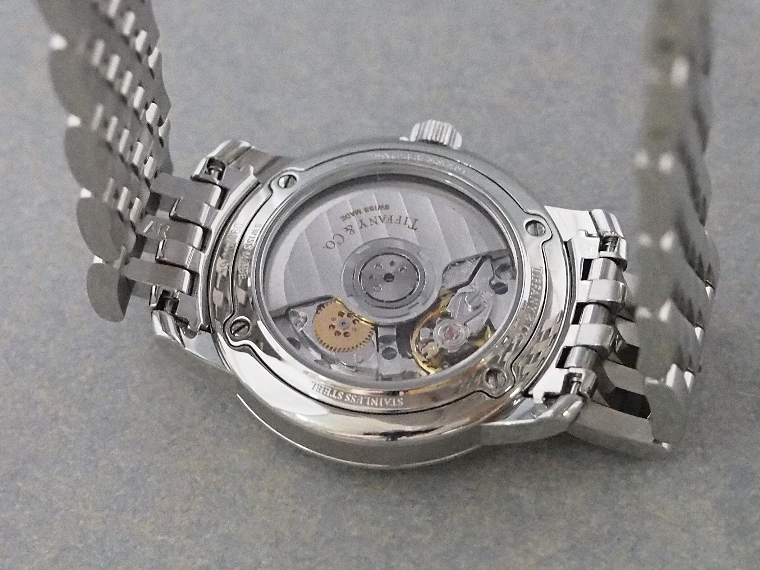 ブレスレットは、軽やかな装着感とジュエリーのような質感を両立させたティファニーらしい仕立てで、時計全体の印象を上品に引き締めています。腕周りは約13.5cm+2コマ(2.4cm)まで対応します。