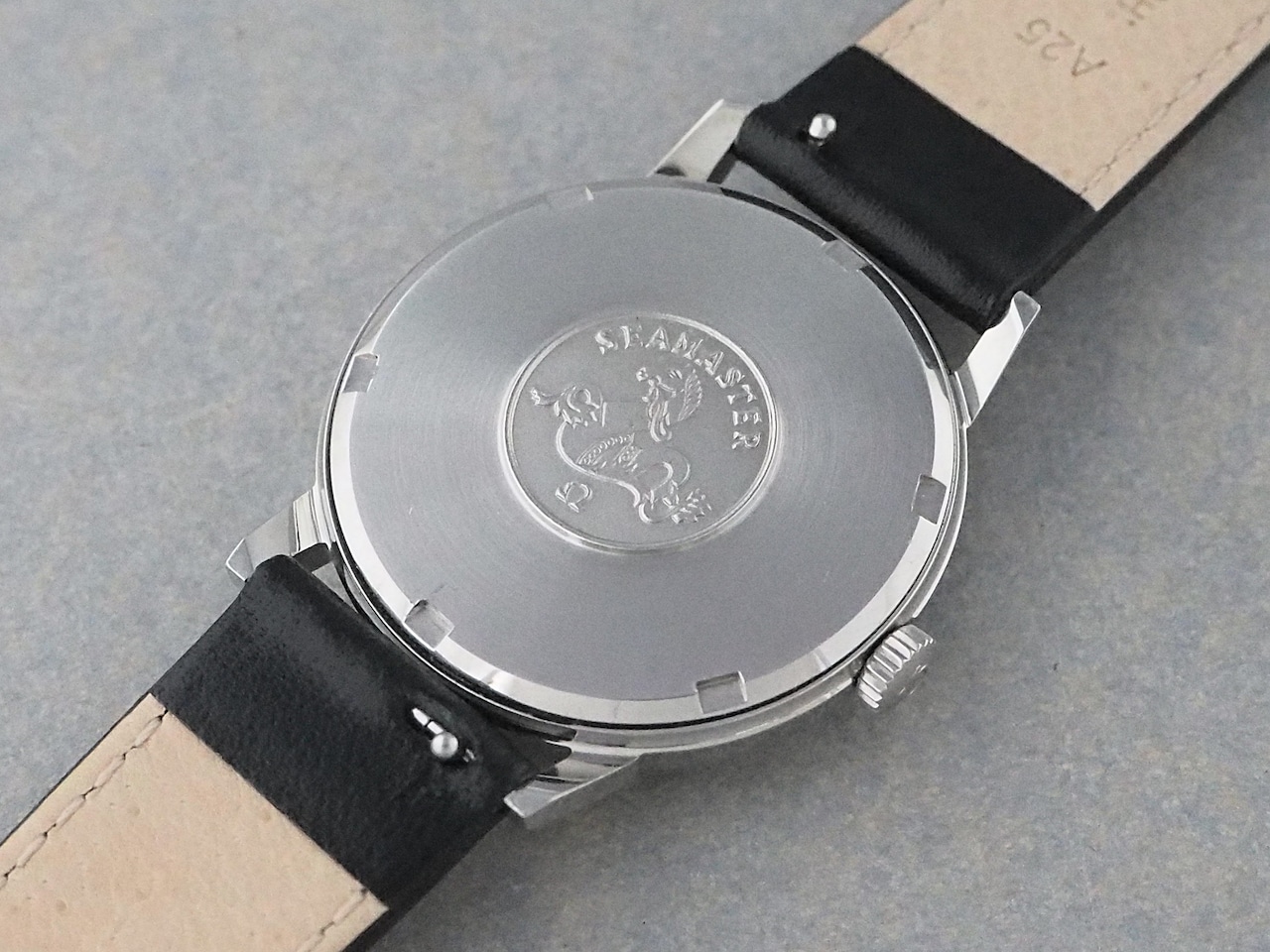 ベゼルのないすっきりとしたシリンダーケースは文字盤側より裏蓋側の口径が僅かに大きい円錐を切り取ったような形状で、シンプルながら洗練されたフォルムです。コンディションは使用感程度で気になる大きなダメージはなく、裏蓋には当時の”防水仕様ケース”を表すシーホースのメダリオンがあります。