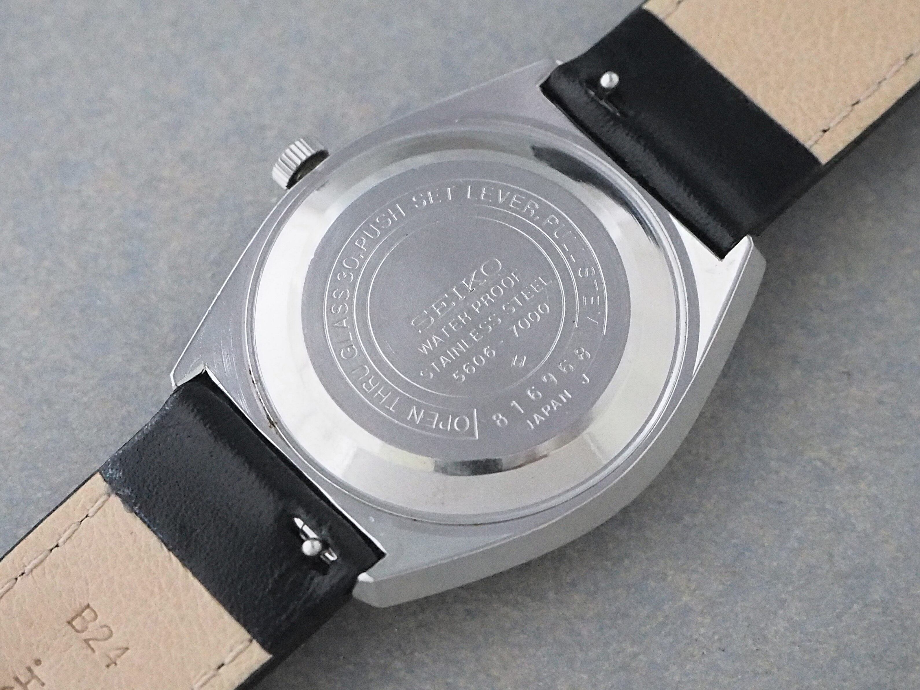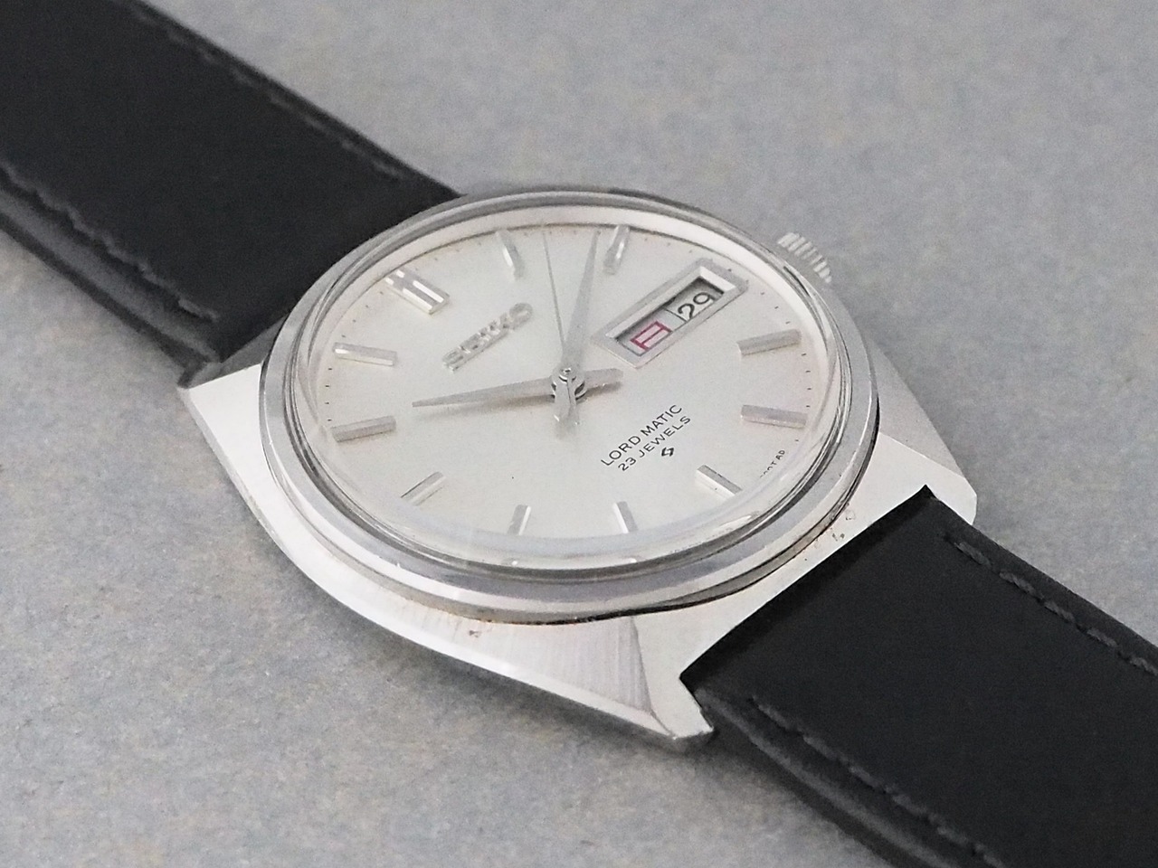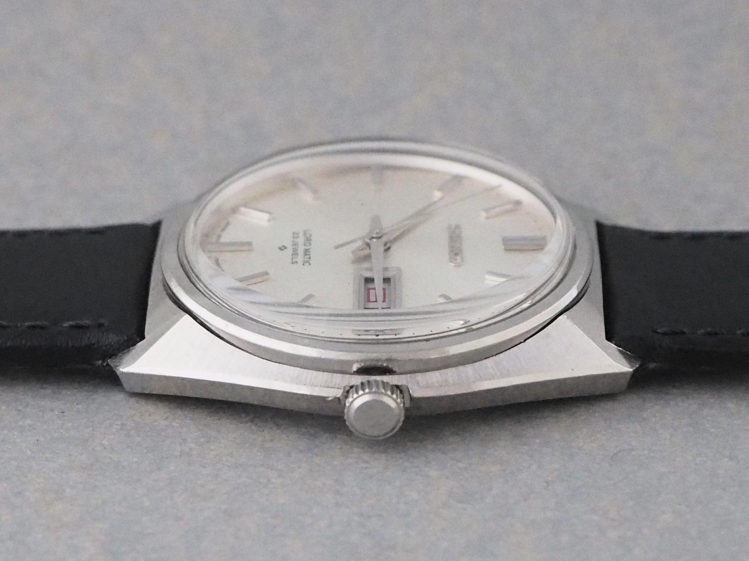 良好なコンディションの文字盤は、端正なドーフィンハンドと存在感のあるバーインデックスによる堅実なデザインで、国産ビンテージウォッチならではの魅力を一層引き立てています。「ロードマチック」は長期製造されていましたが、その中で初期のモデルは「LM」ではなく「LORD MATIC」と文字盤に表記されています。