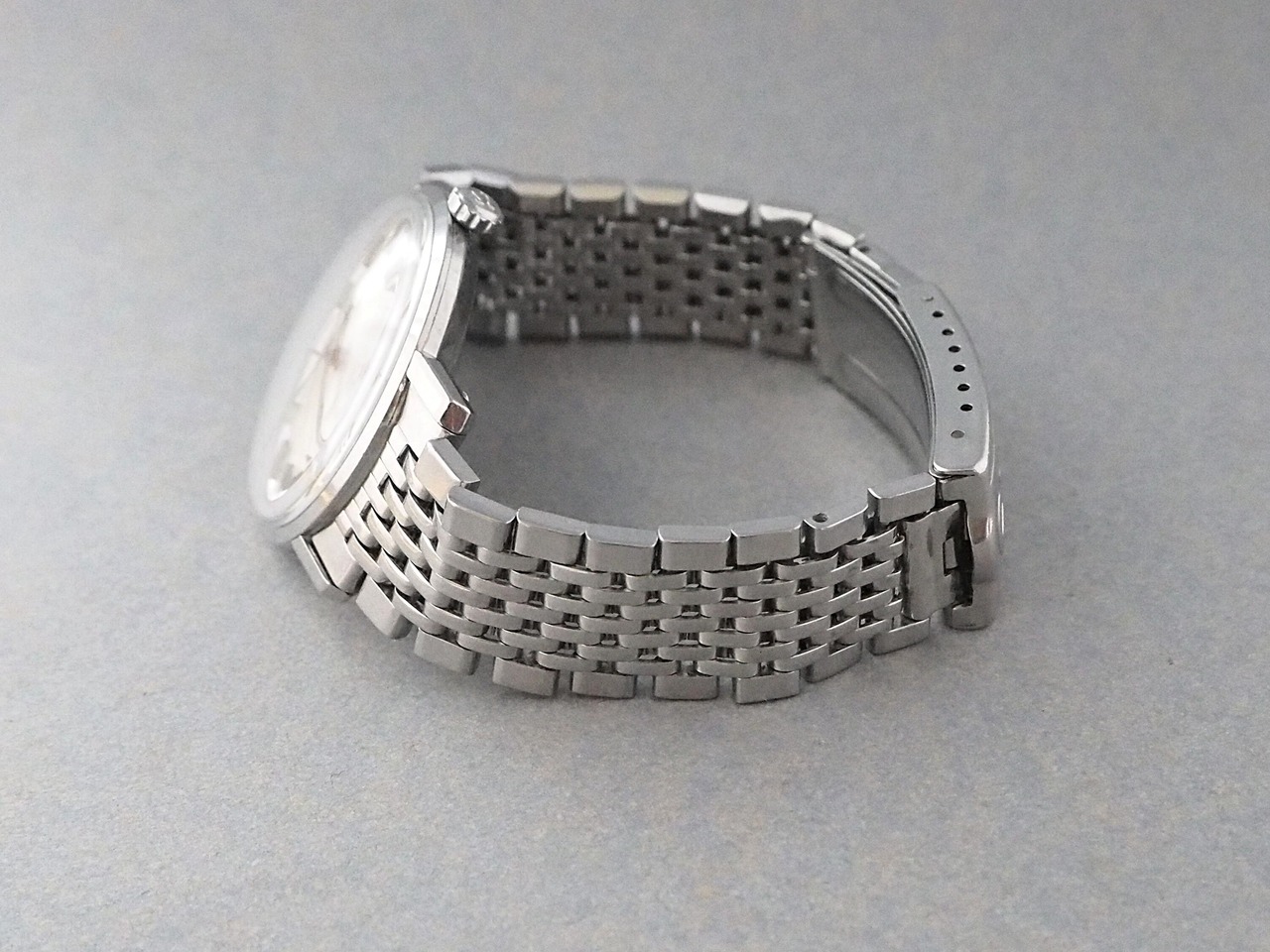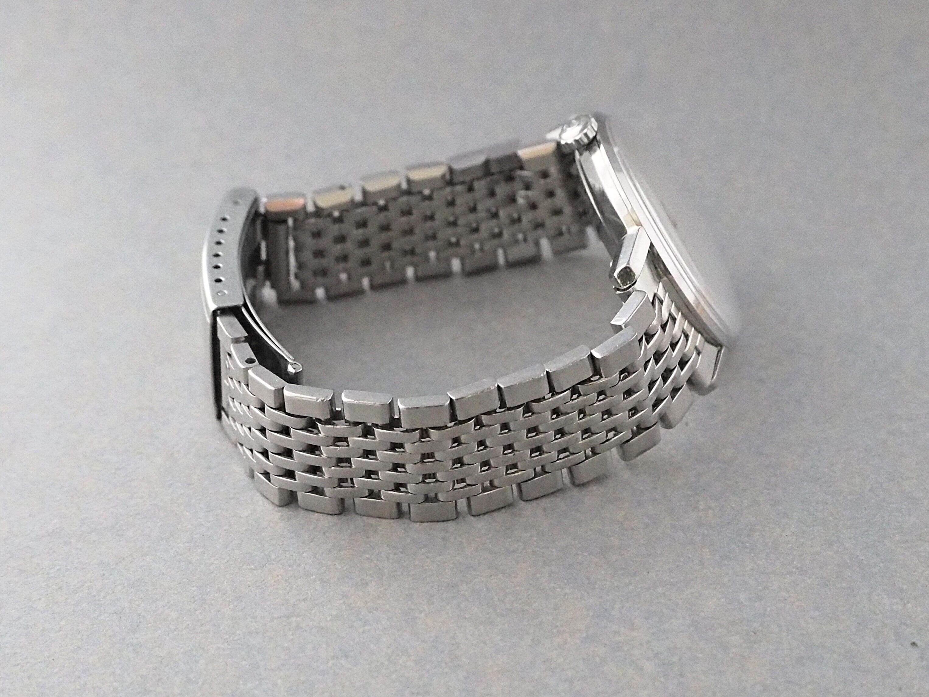 ワンピース仕様のケースも使用感程度で、目立つキズや劣化は見られません。ケースバックの「シーマスター」の証であるシーホース刻印もしっかり残り、シャープな細いラグにはエレガントな「デ・ビル」らしさを感じさせる、双方の魅力を兼ね備えたケースデザインです。
