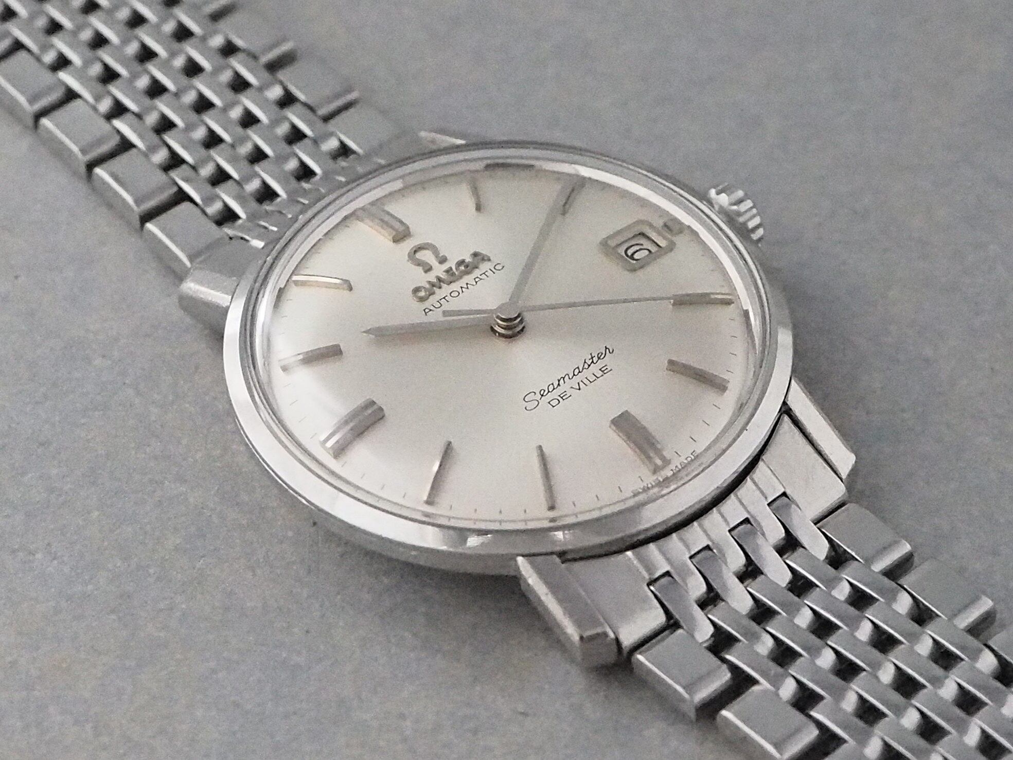 「デ・ビル」はもともと「シーマスター」の一部として登場し、その後独立したコレクションへと展開されました。両モデル名が記されたWネームは流通数が少なく、ビンテージウォッチファンから「ボンベダイヤル」と呼ばれるふっくらとした文字盤にオメガならではの端正なフェイスデザインが特徴です。