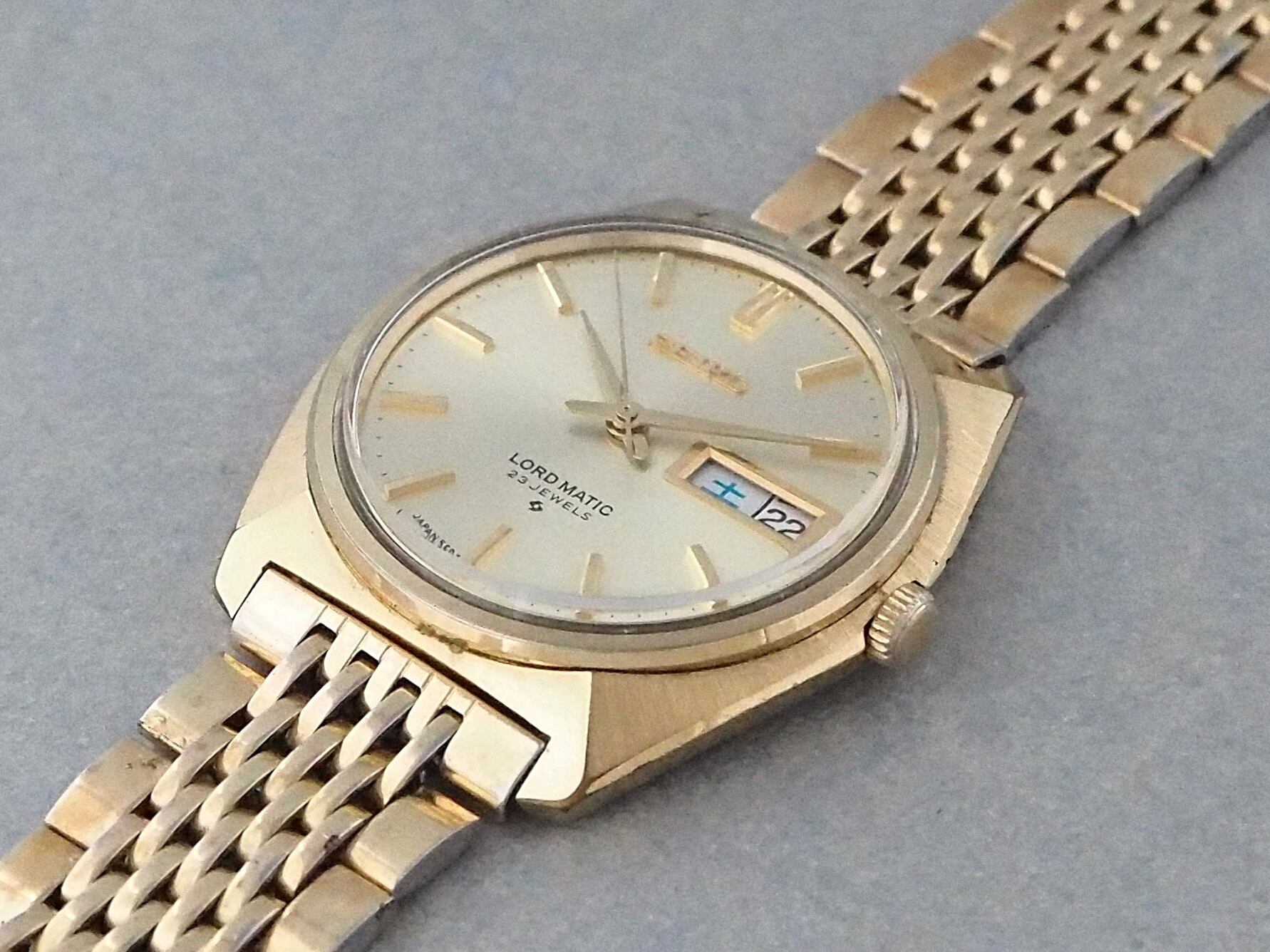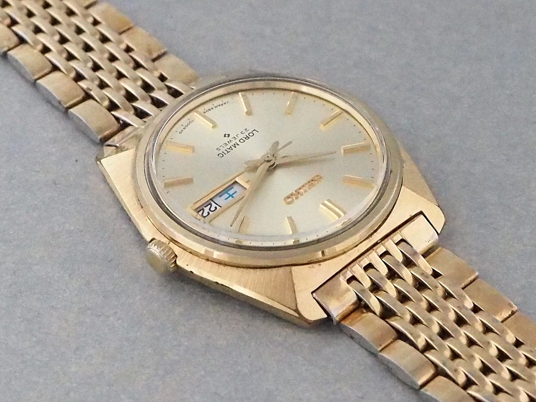 長きにわたり製造された「ロードマチック」には様々なバリエーションがありますが、このモデルは「SGP・Seiko Gold Plating」仕様のケースに、ダイヤルもゴールド色でまとめたエレガントなスタイルが特徴です。また、コンディション良好な文字盤の6時位置には「LM」ではなく、初期型に見られる「LORD MATIC」の表記が使われています。