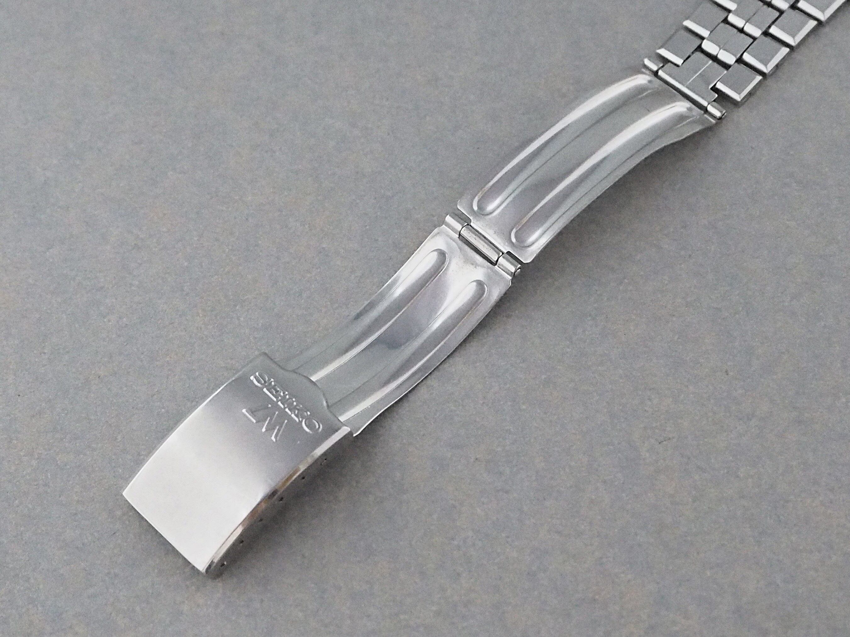 ケースと弓カンも文字盤に合わせ、中央のラインに沿った部分がわずかに盛り上がることでアクセントとなり、統一感のあるデザインに仕上がっています。コンディションは年代相応に多少の使用感はありますが、気になる大きなキズはありません。