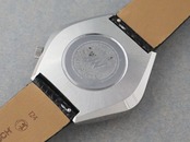 サイドが膨らんだ特徴的なフォルムのワンピースケースは、上面の放射状ヘアラインと側面の鏡面が丁寧に仕上げられ、4時位置にリューズを配した個性的なスタイルです。ケース径39mmは当時としてはやや大ぶりなサイズですが、装着するとそこまで大きさを感じさせず、均整のとれたケースデザインでスマートに腕元に収まります。
