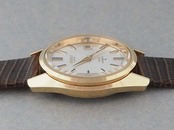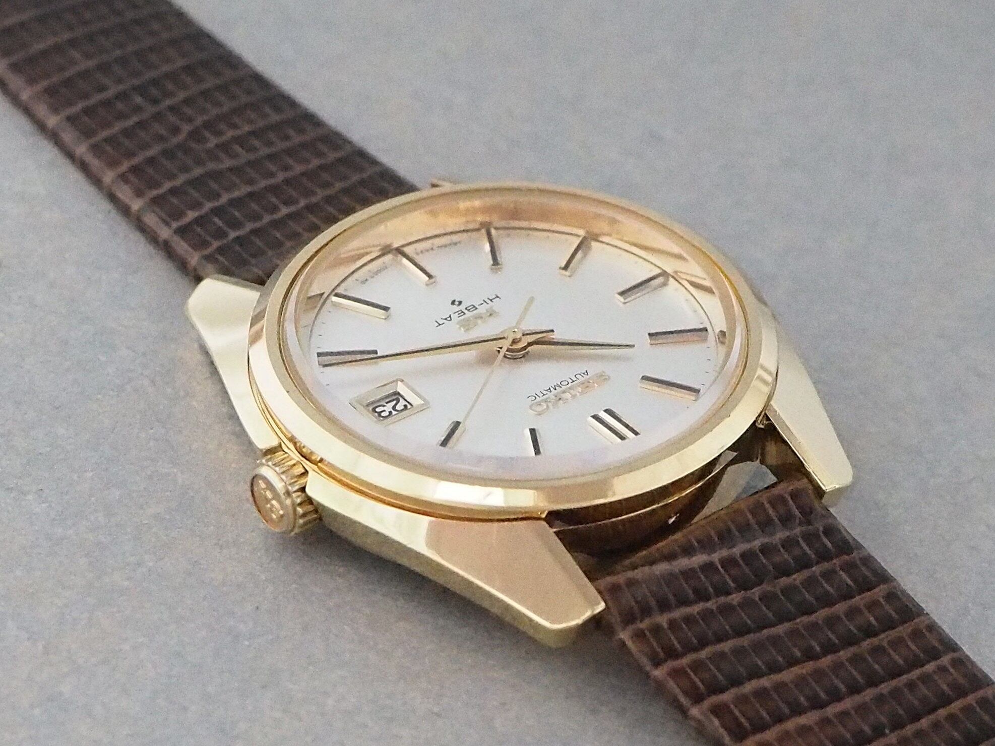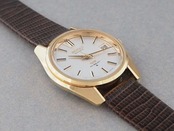 様々なバリエーションが展開された「56KS」ですが、このモデルはワンピースケースの『SGP(Seiko Gold Plating)』仕上げのタイプで、金色がケースデザインとの相性も良く、SSモデルとは印象が大きく異なるほどスタイリッシュです。スマートさを感じさせるシルバーの文字盤上にはアップライドの「SEIKO」と「KS」が輝きを放ち、細身のインデックスや針と共に高級機としての気品を感じさせます。