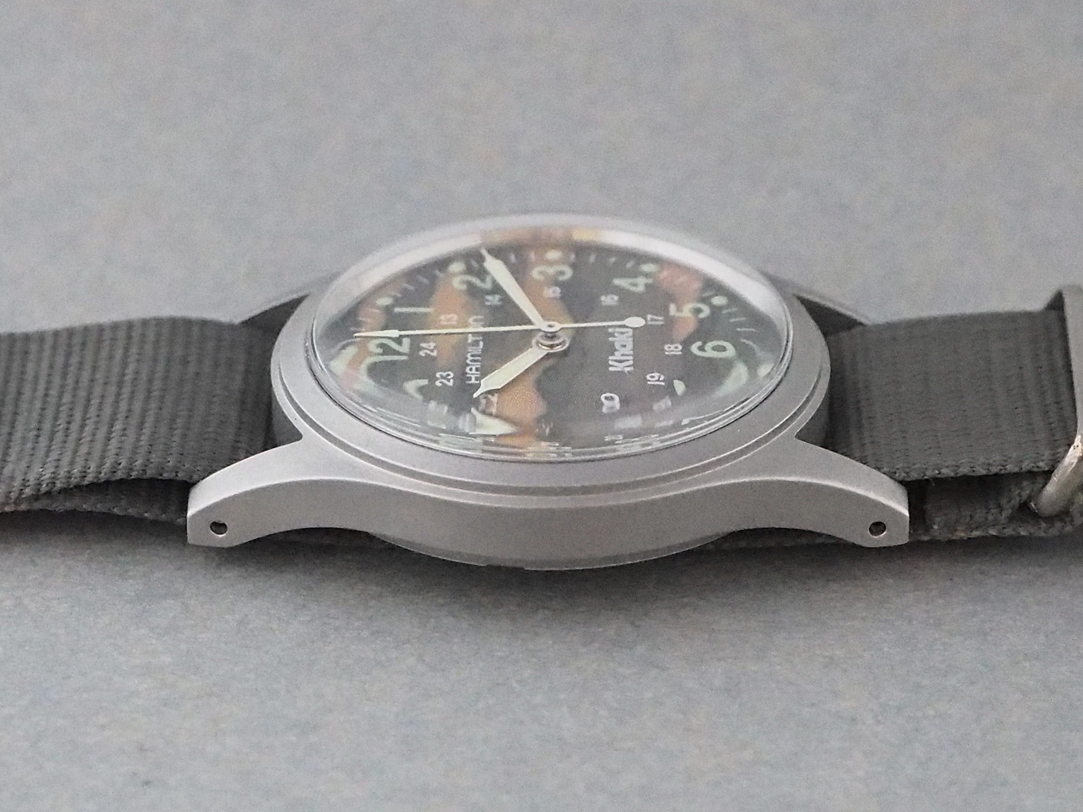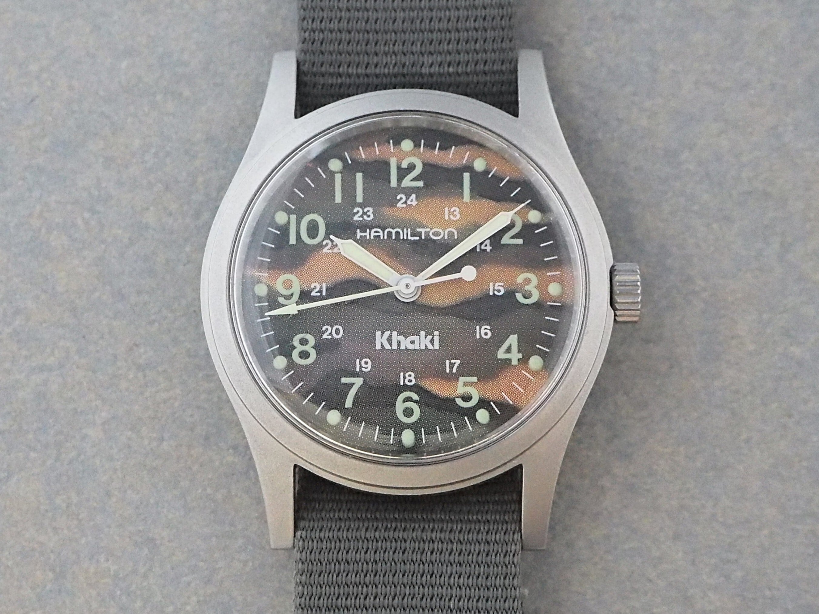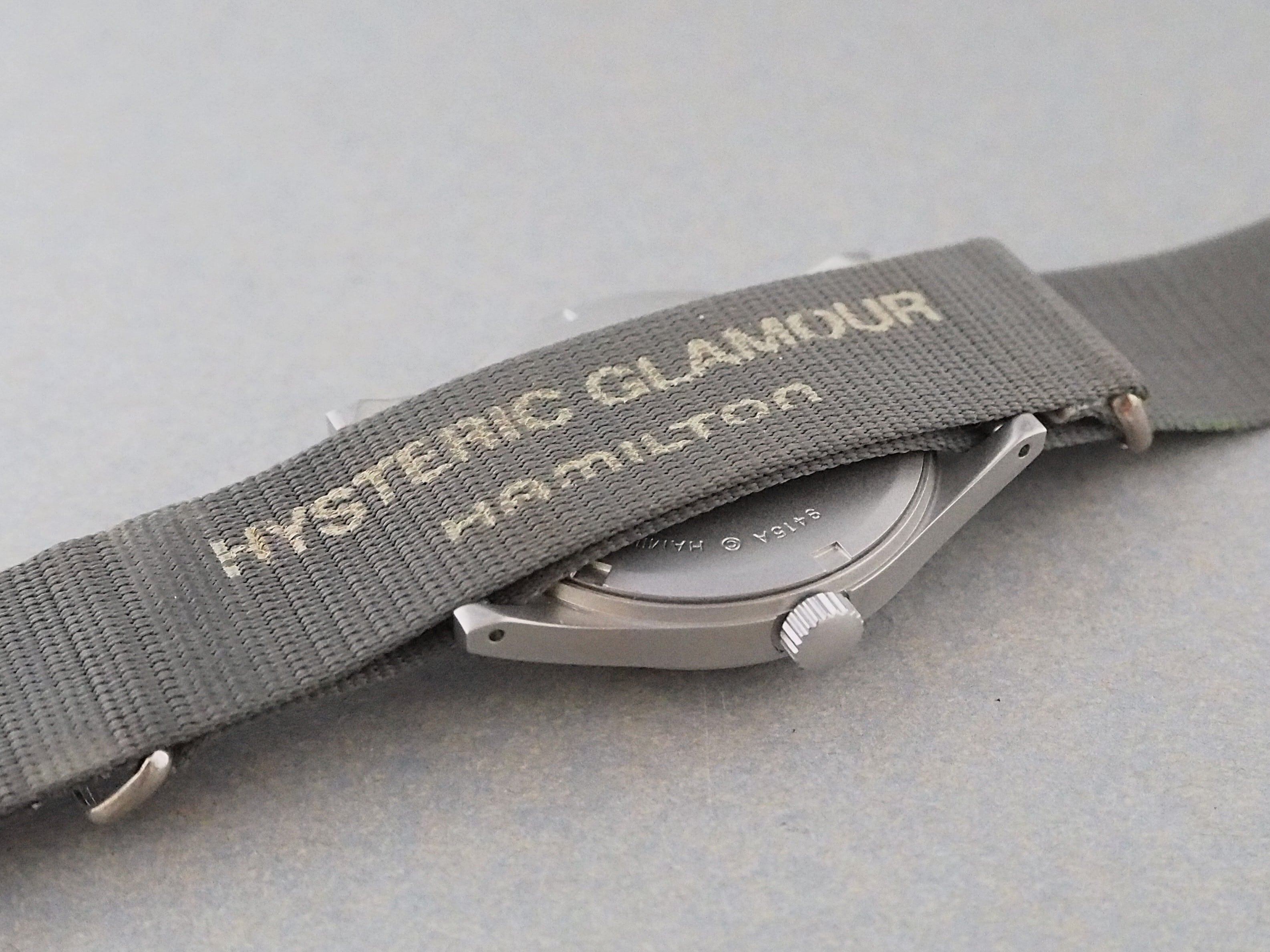 現在まで様々なバリエーションが存在しますが、当初は手巻き式でケースサイズはミルスペック仕様と同じ33mmでした。こちらは、ファッションブランド HYSTERIC GLAMOUR(ヒステリックグラマー) の別注モデルで、迷彩柄の文字盤が特徴です。裏蓋にはHYSTERIC GLAMOURの刻印があります。