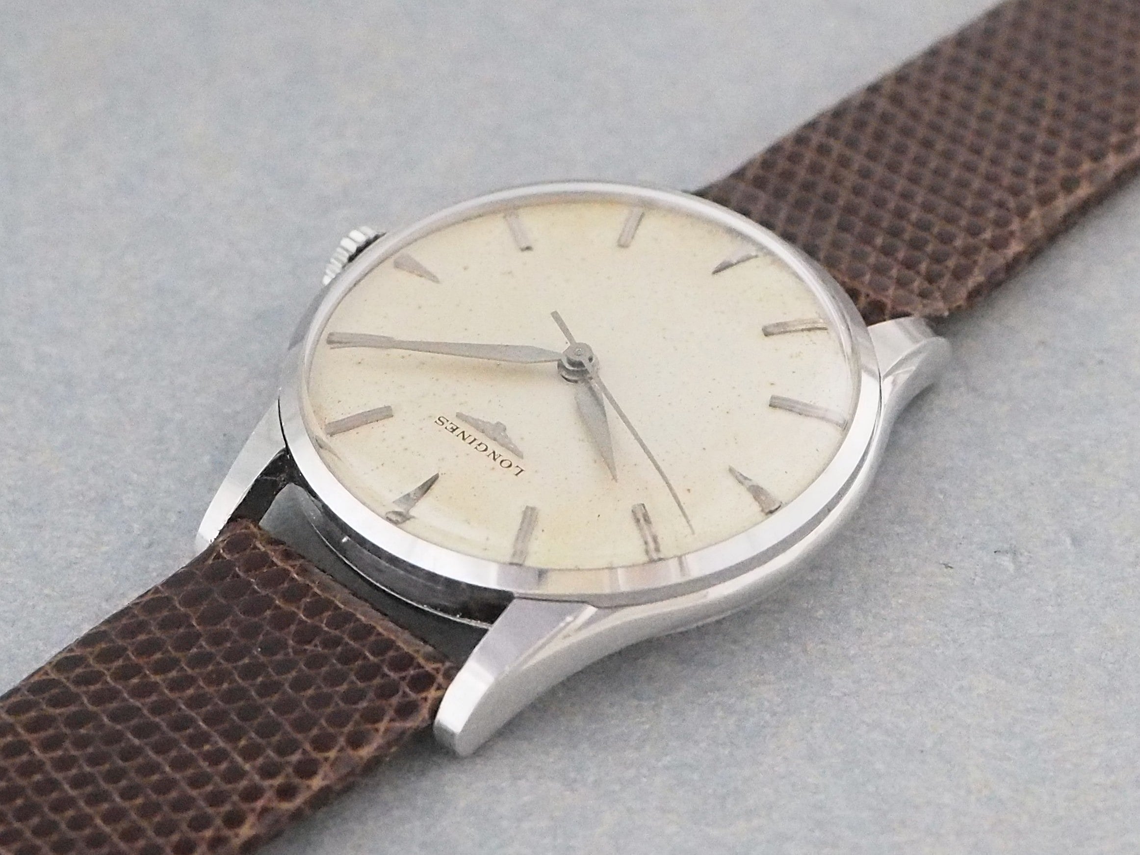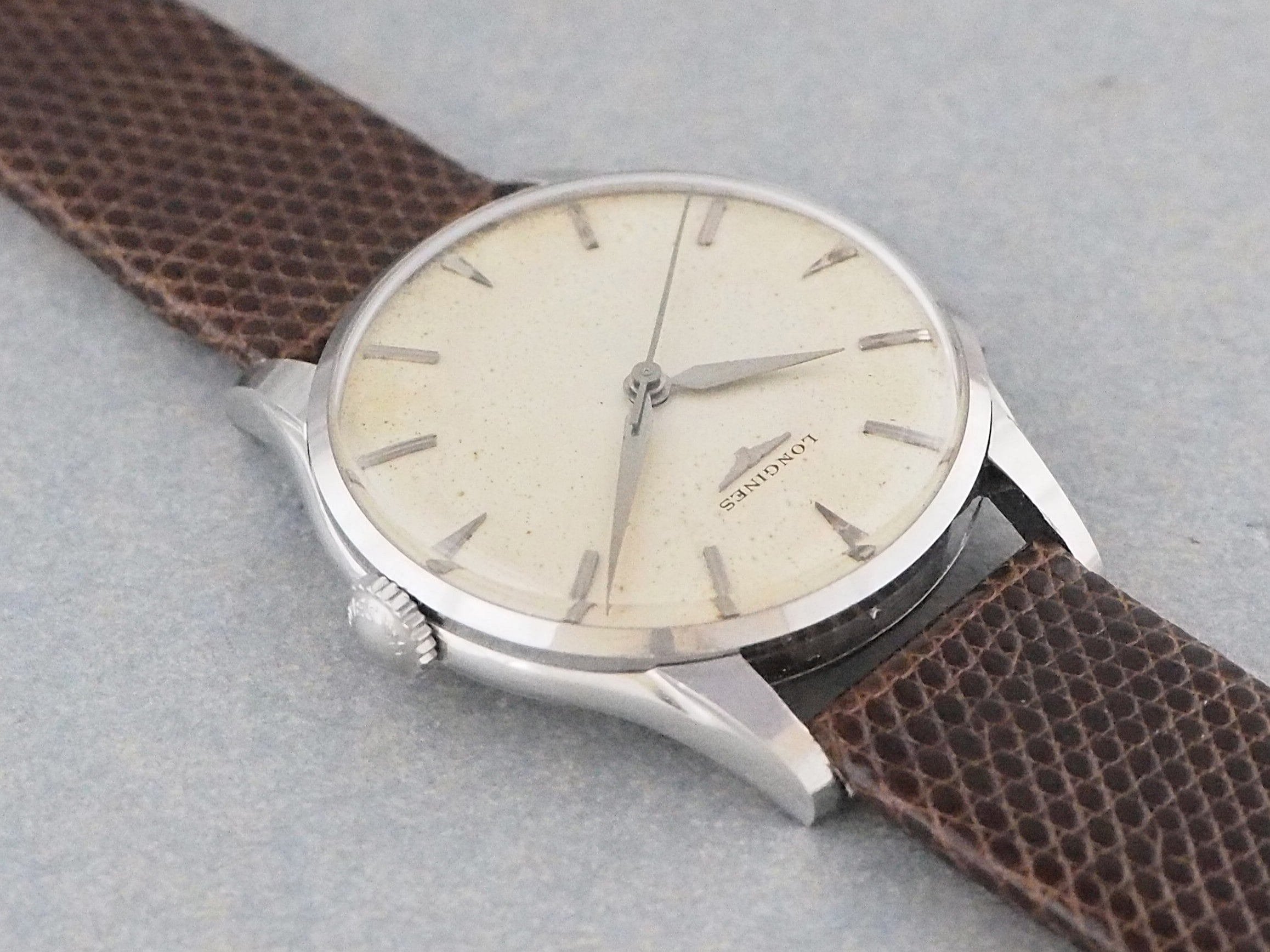 文字盤は経年によりビンテージならではの風合いを漂わせ、シャープなアルファハンドとセンターに配されたクサビ型とバーインデックスの組み合わせが、ロンジンらしい古典的な美しさを感じさせます。
