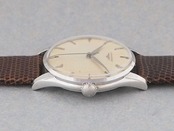 ケースは一見シンプルですが、サイドの丸みがラグまで溶け込むように伸びたディテールがさりげなく目を引く個性的な造形です。コンディションは使用感程度で大きなダメージはなく、ケース径35.5mmは大きすぎず小さすぎない程よいサイズ感で、ビンテージウォッチが初めての方にもおすすめできるモデルです。