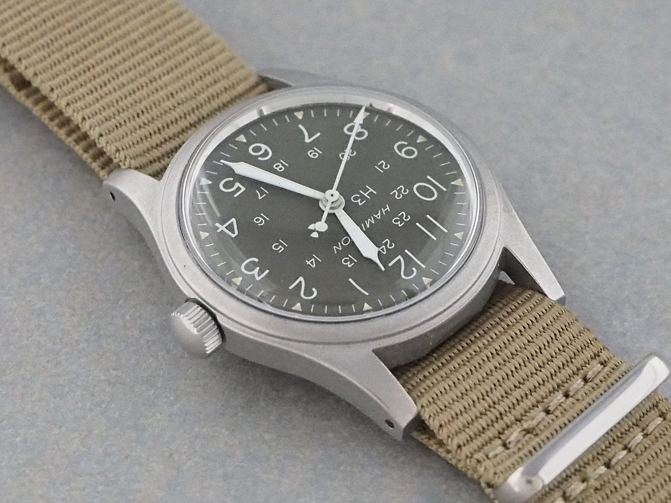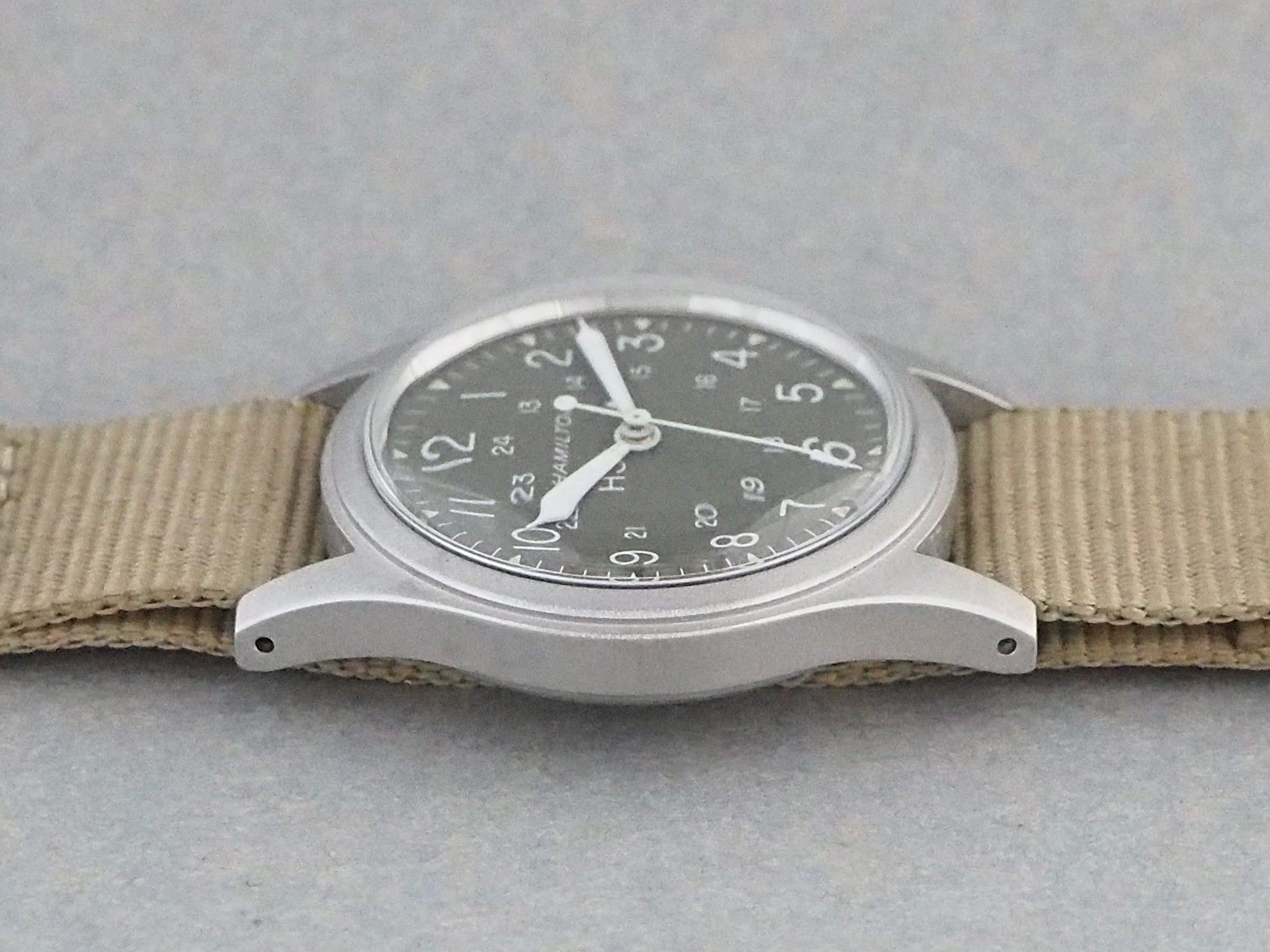 こちらは『Khaki』シリーズの初期モデルです。ベルトの取り付け幅が若干狭い17.6mmでムーブメントは後期モデルよりも一世代前の6振動のCal.2750を搭載しています。