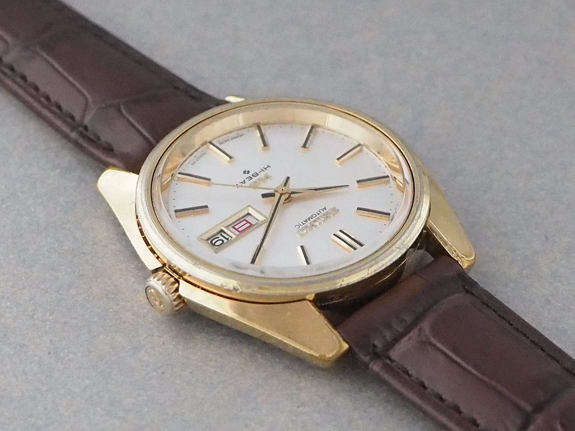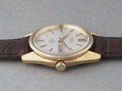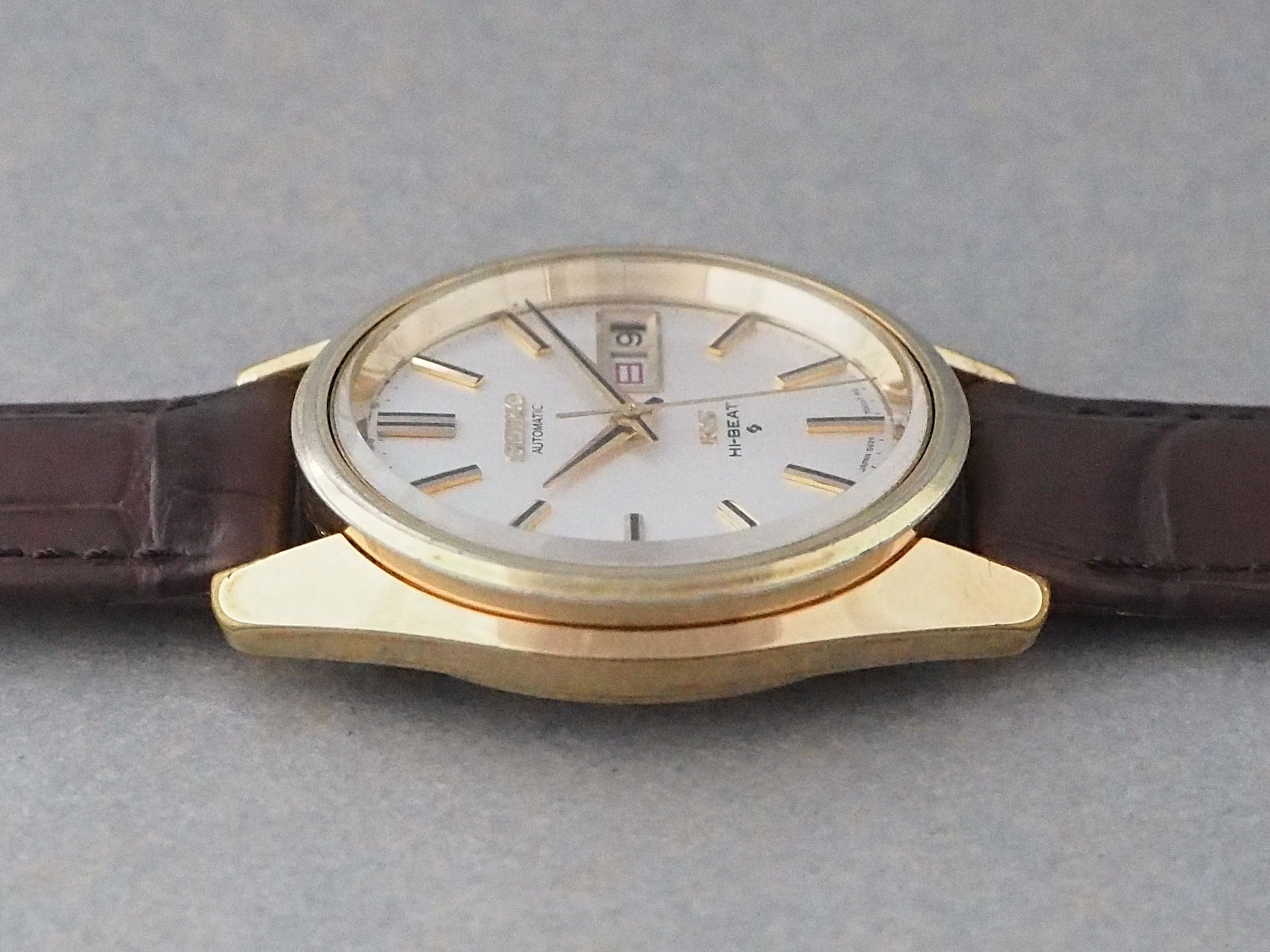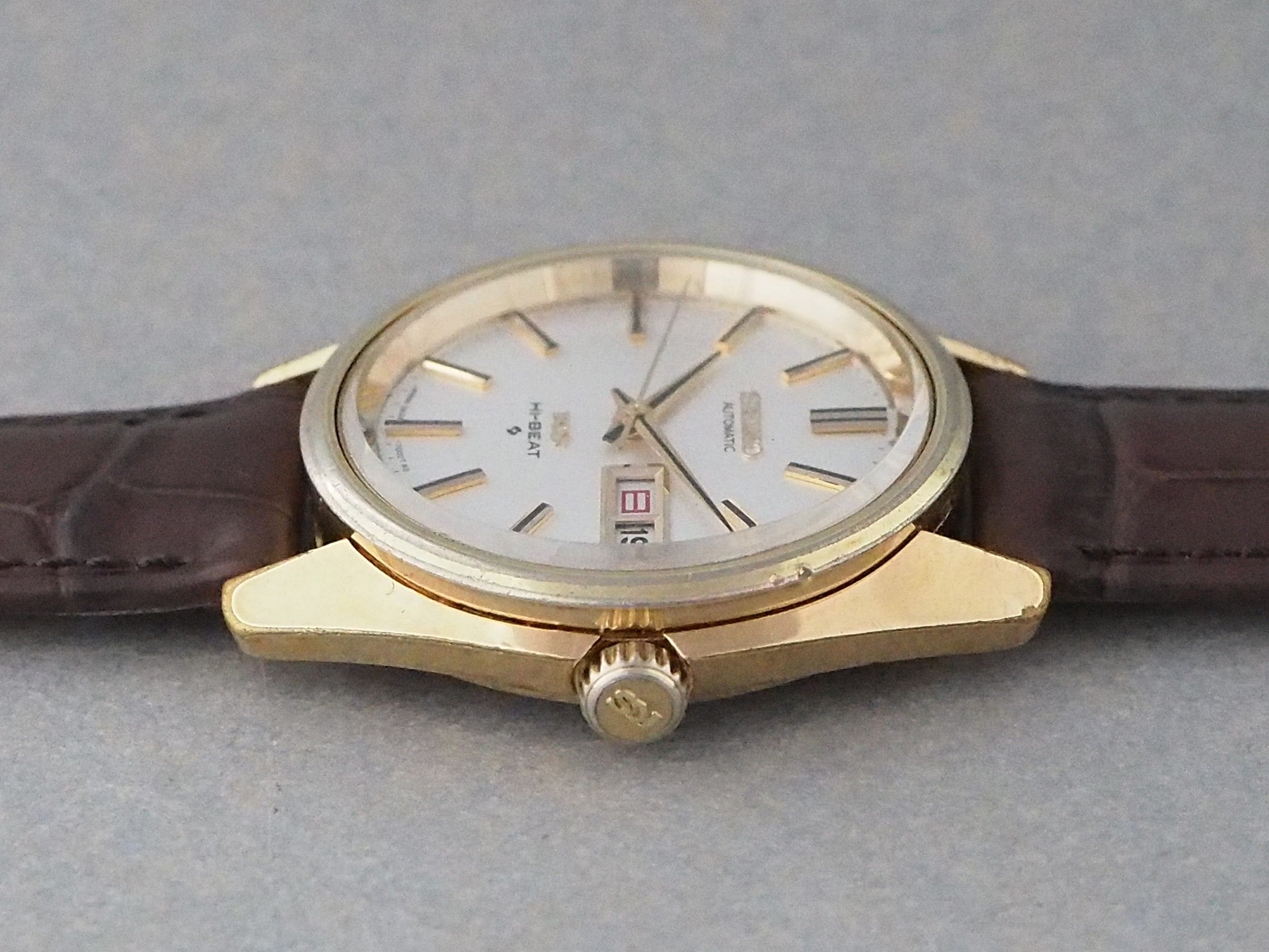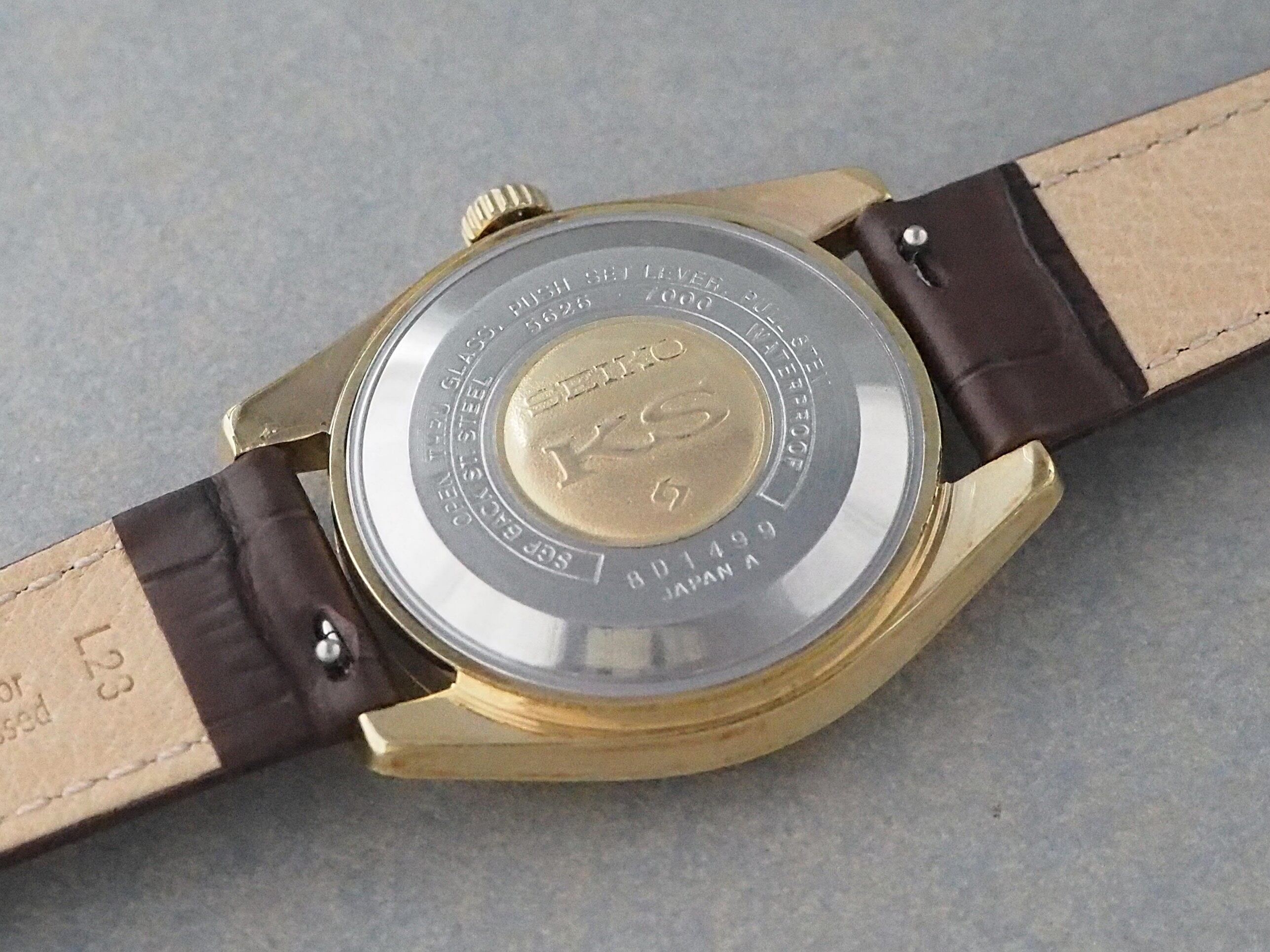 様々なバリエーションが展開された「56KS」ですが、このモデルはワンピースケースの『SGP(Seiko Gold Plating)』仕上げのタイプで、金色がケースデザインとの相性も良く、SSモデルとは印象が大きく異なるほどスタイリッシュです。ワンピース構造のケースは、ラグの先端部分などにメッキの剥がれが見られるものの、違和感のない自然な風合いがしっかりと感じられるビンテージ時計らしい雰囲気が楽しめます。