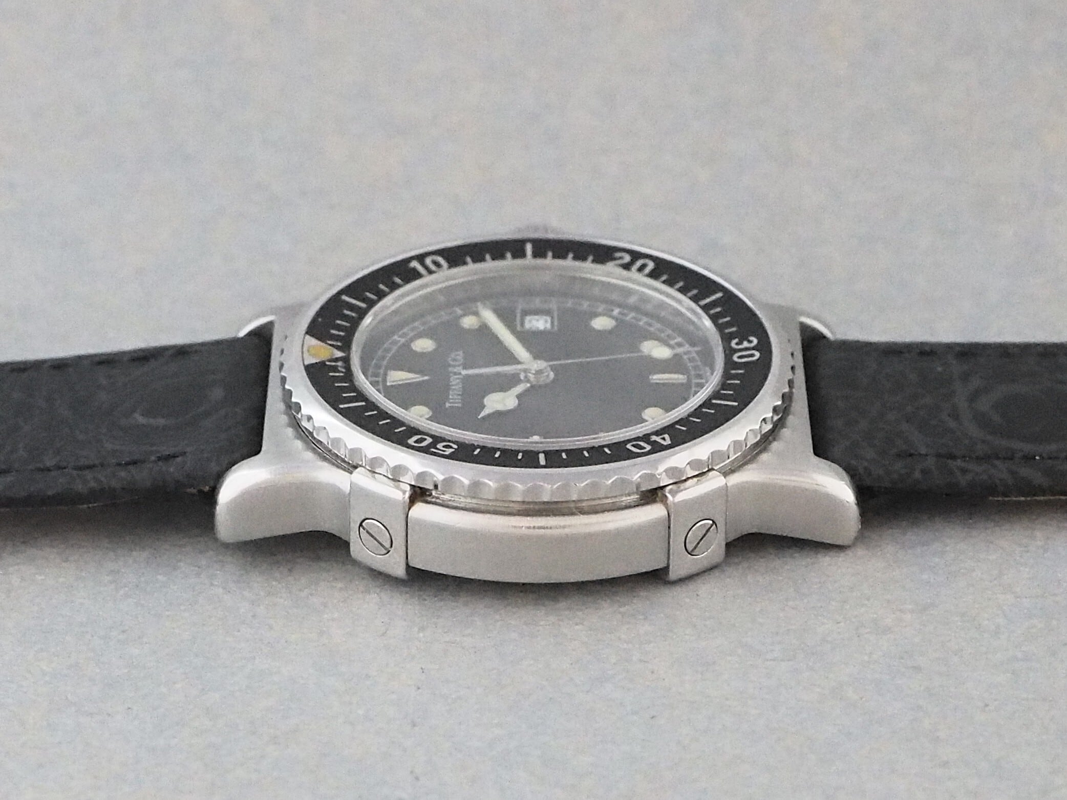 ティファニーでは珍しいスポーツテイストのダイバーズモデルで、32mm径のステンレススティール製の小ぶりなケースに、回転ベゼルやねじ込みリューズを備えた本格的な仕様が特徴です。