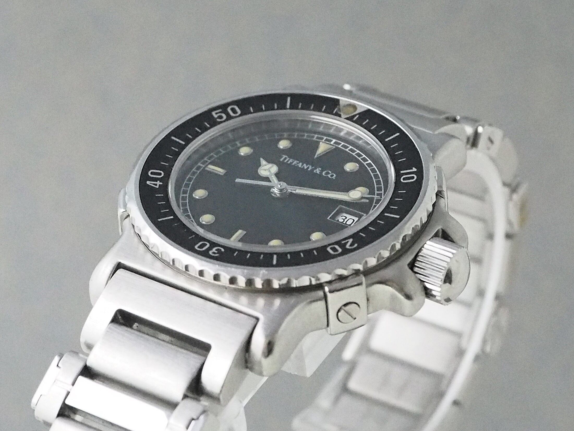 夜光を備えたドットインデックスや針の形状など、ダイバーならではのデザインを取り入れたブラックダイヤルに、“Tiffany & Co.” のロゴのみを配したシンプルなフェイスです。画像ではわかりづらいですが、ベゼルと文字盤はわずかにグレーがかった色味で、これがオリジナルのトーンなのか経年によるものかは定かではありませんが、上品で落ち着いた印象を与えています。
