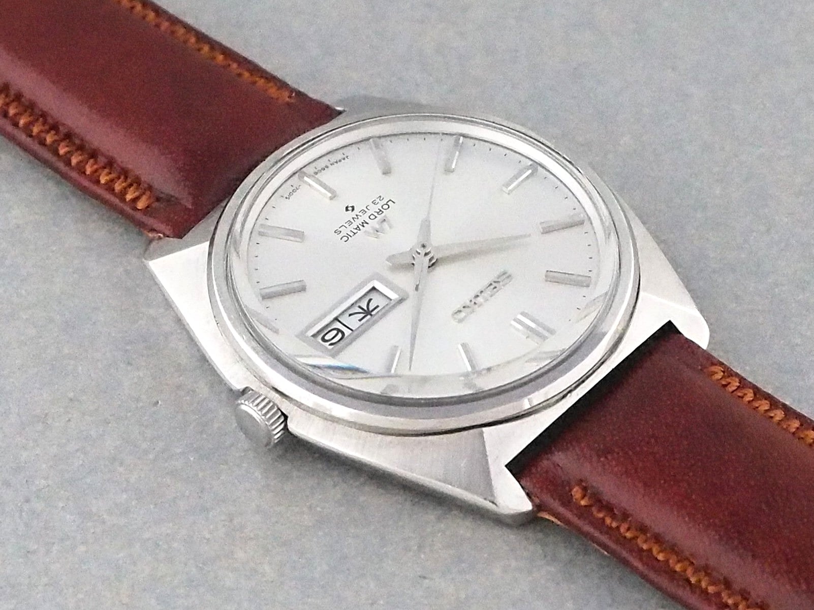 文字盤は、端正なドーフィンハンドと存在感のあるバーインデックスによる国産ビンテージならではの堅実なデザインです。6時位置のモデル名にはファーストモデルから続く「LORD MATIC」と、後年のアップライトによる「LM」の両方が表記されており、デザイン移行期ならではの仕様も特徴となっています。