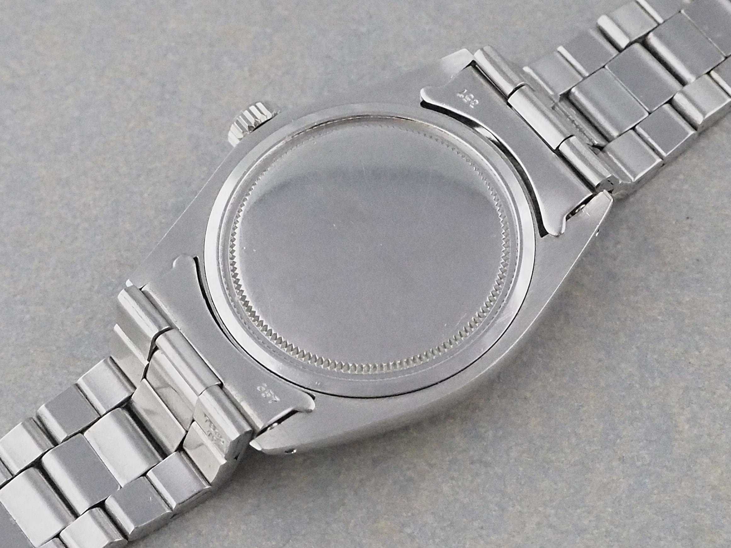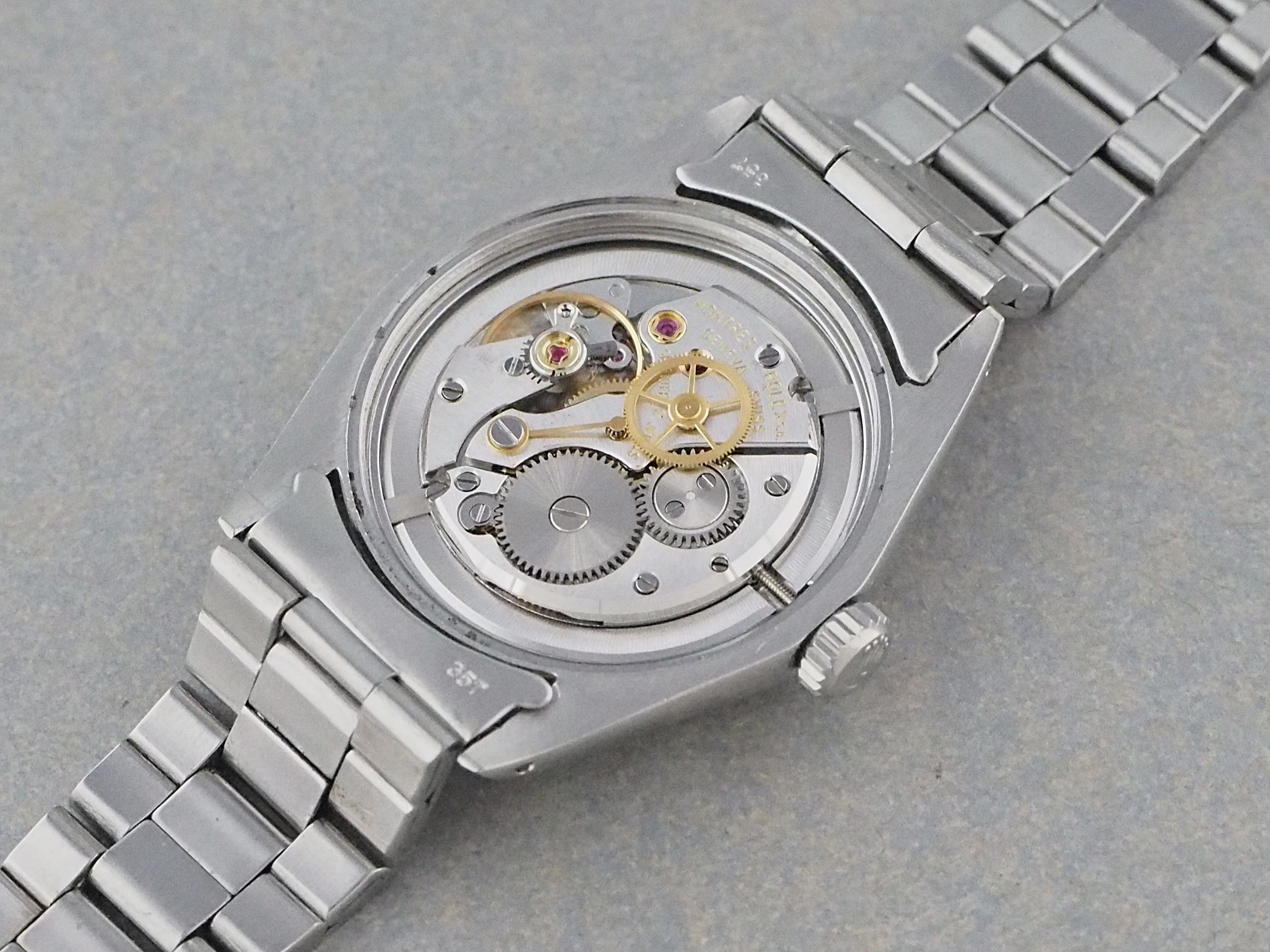 美しく整えられたデザインが際立つ、すっきりとしたノンデイトのフェイスは、バーインデックスにペンシルハンド、さらに秒針も磨き込まれた仕上げで存在感を示しています。経年によりわずかに変色した文字盤には落ち着きが感じられ、ビンテージモデルらしい魅力が漂います。