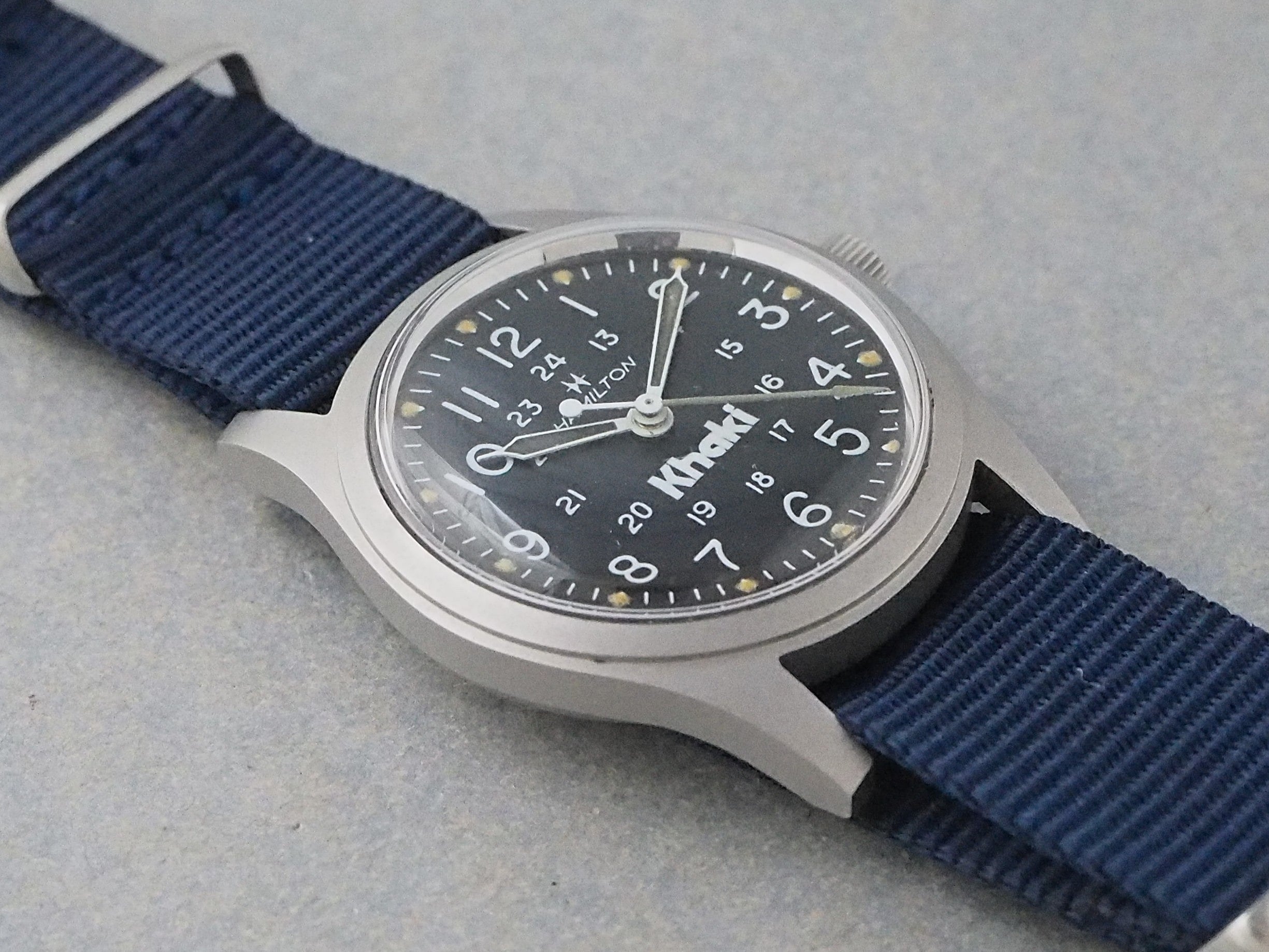 こちらは、文字盤に軽微なダメージが見られ、針やインデックスの夜光塗料も劣化しています。また、秒針の白塗装は根元から先端にかけて剥がれていますが、逆にミリタリースタイルの時計としては少し使い込まれた雰囲気が魅力的です。