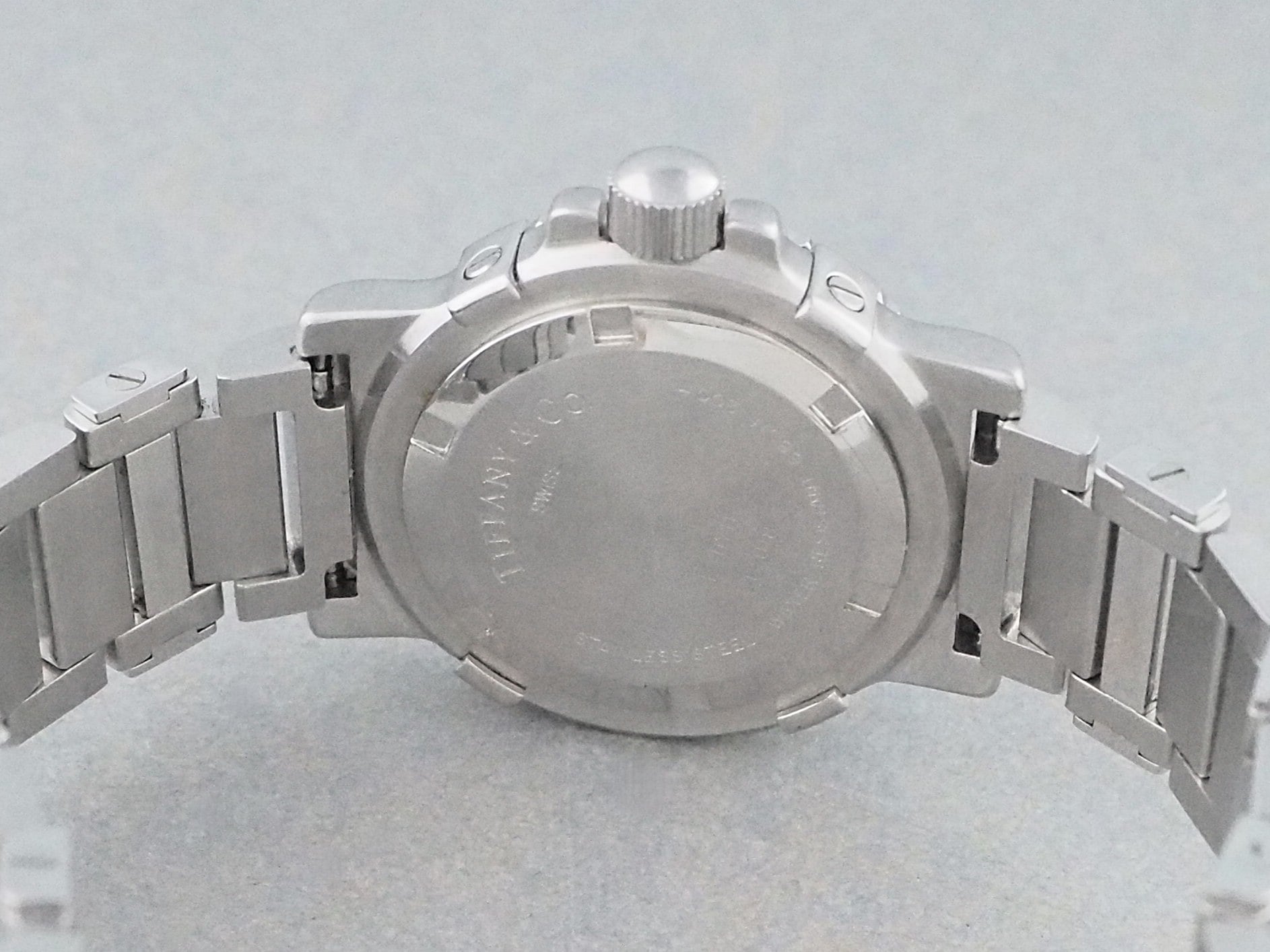 夜光を備えたドットインデックスや針の形状など、ダイバーならではのデザインを取り入れたブラックダイヤルに、“Tiffany & Co.” のロゴのみを配したシンプルなフェイスが、控えめながら上品さを感じさせます。
