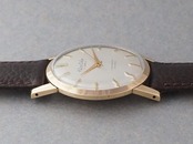 14K金張りのケースもビンテージならではの仕様で、薄型のすっきりとしたフォルムが時計全体のシンプルな美しさを際立たせています。ケース径は34.5mmで日常使いしやすく、幅広いスタイルに合わせやすいサイズ感です。