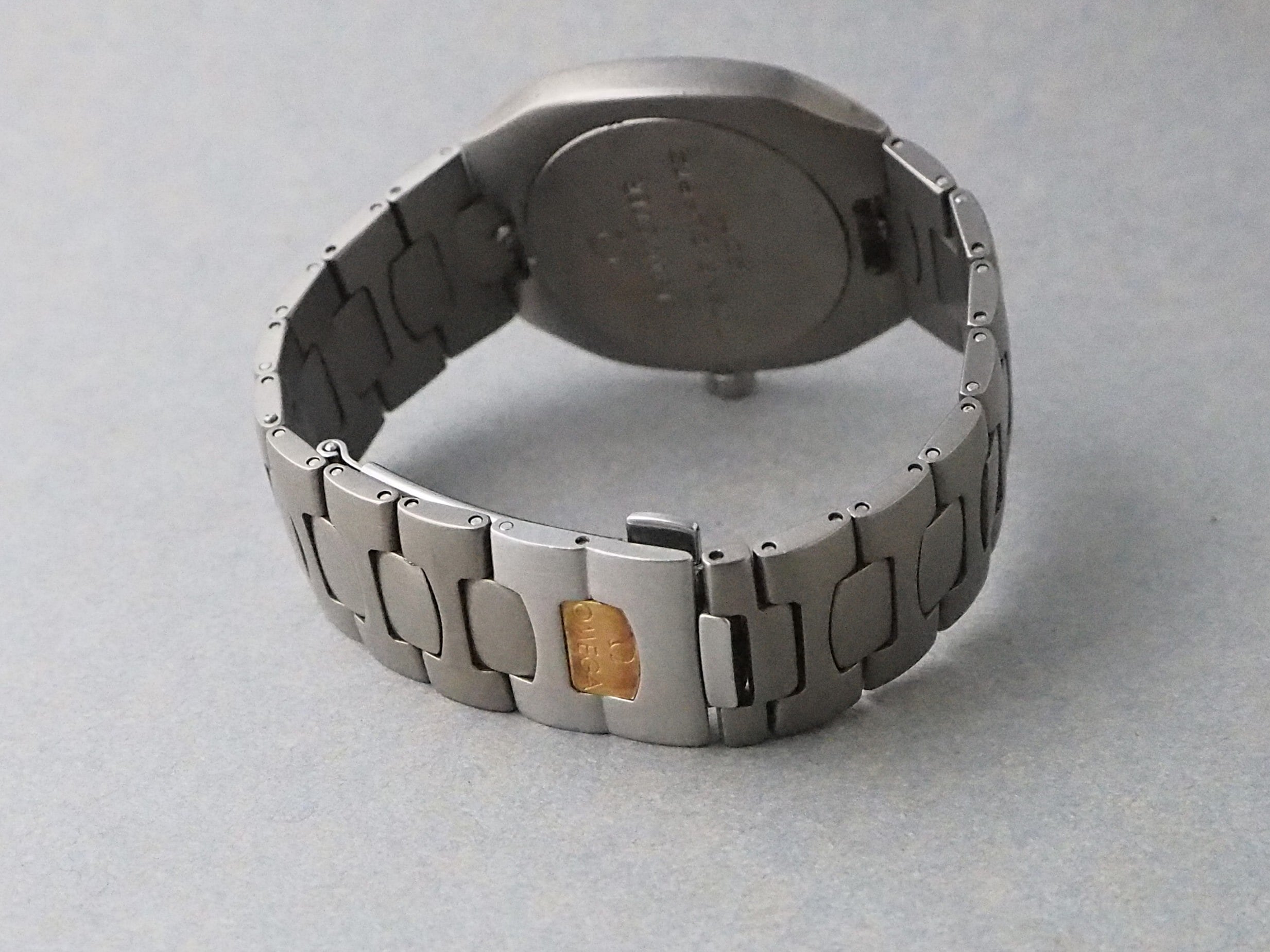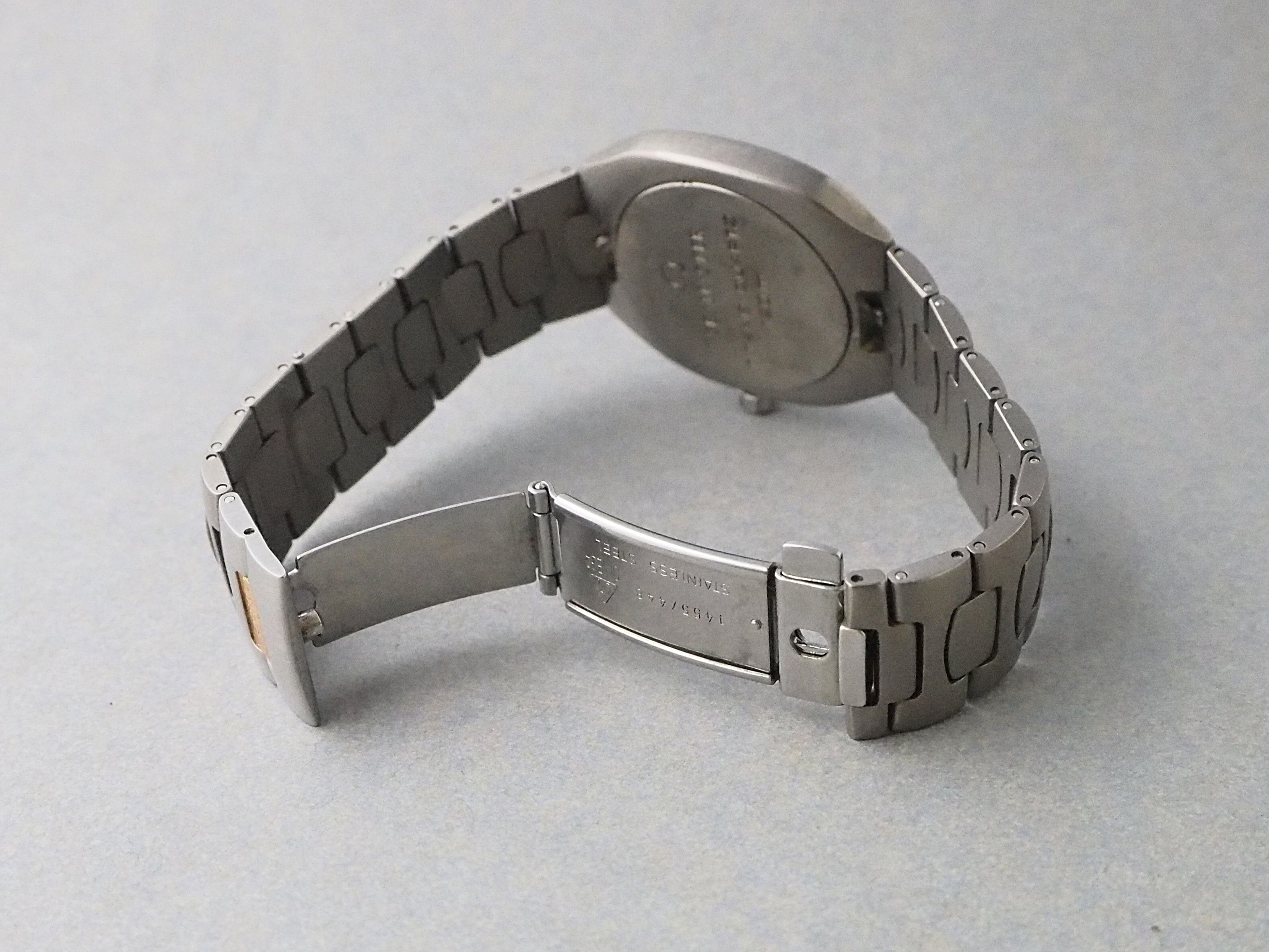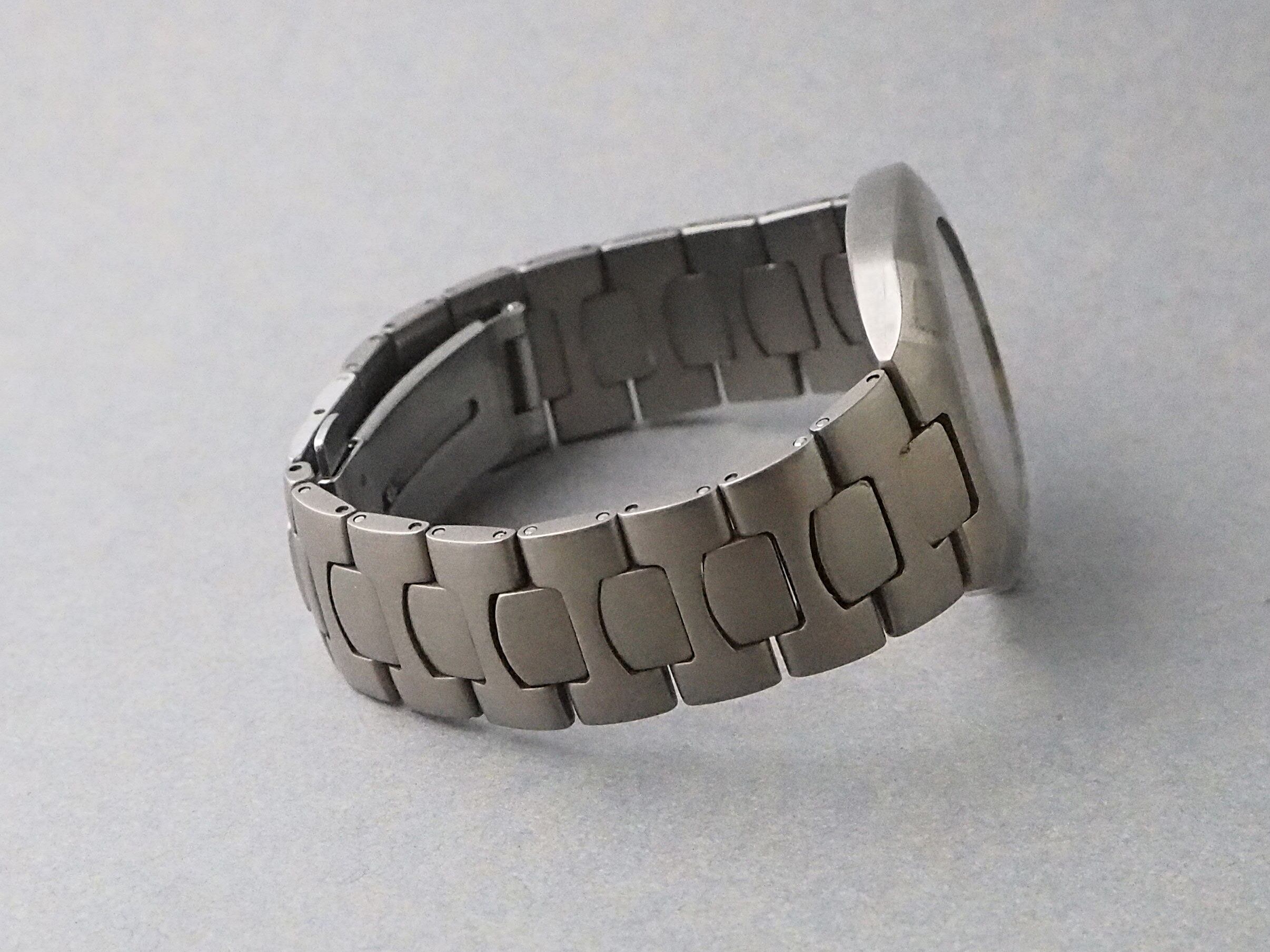 チタン製の独特なケースフォルムが魅力的で、ケースのインレイにパラジウムを使用した希少モデルです。