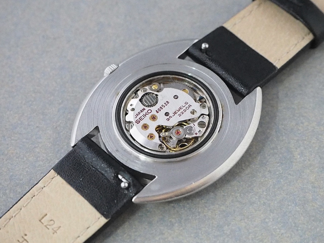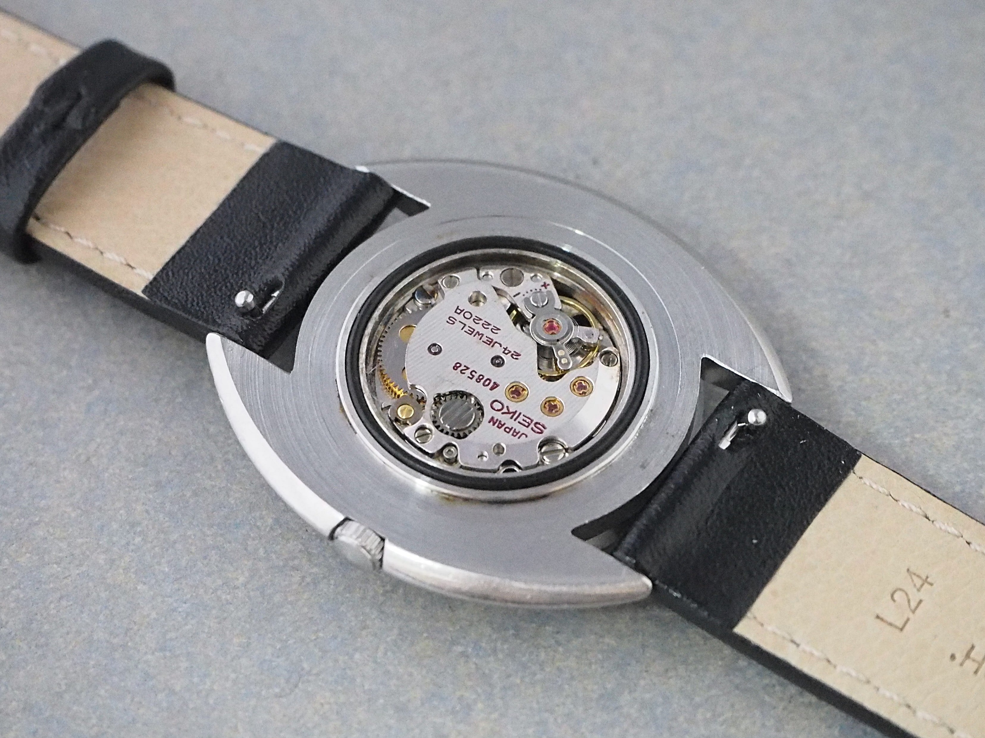 ムーブメントはレディースウォッチにも搭載されていた小型の手巻き式ハイビートムーブメント、Cal.2220が使われています。70年代中盤はすでにクオーツが主流になりつつあった年代で、同じようなデザインのクオーツタイプも発売されていたようです。