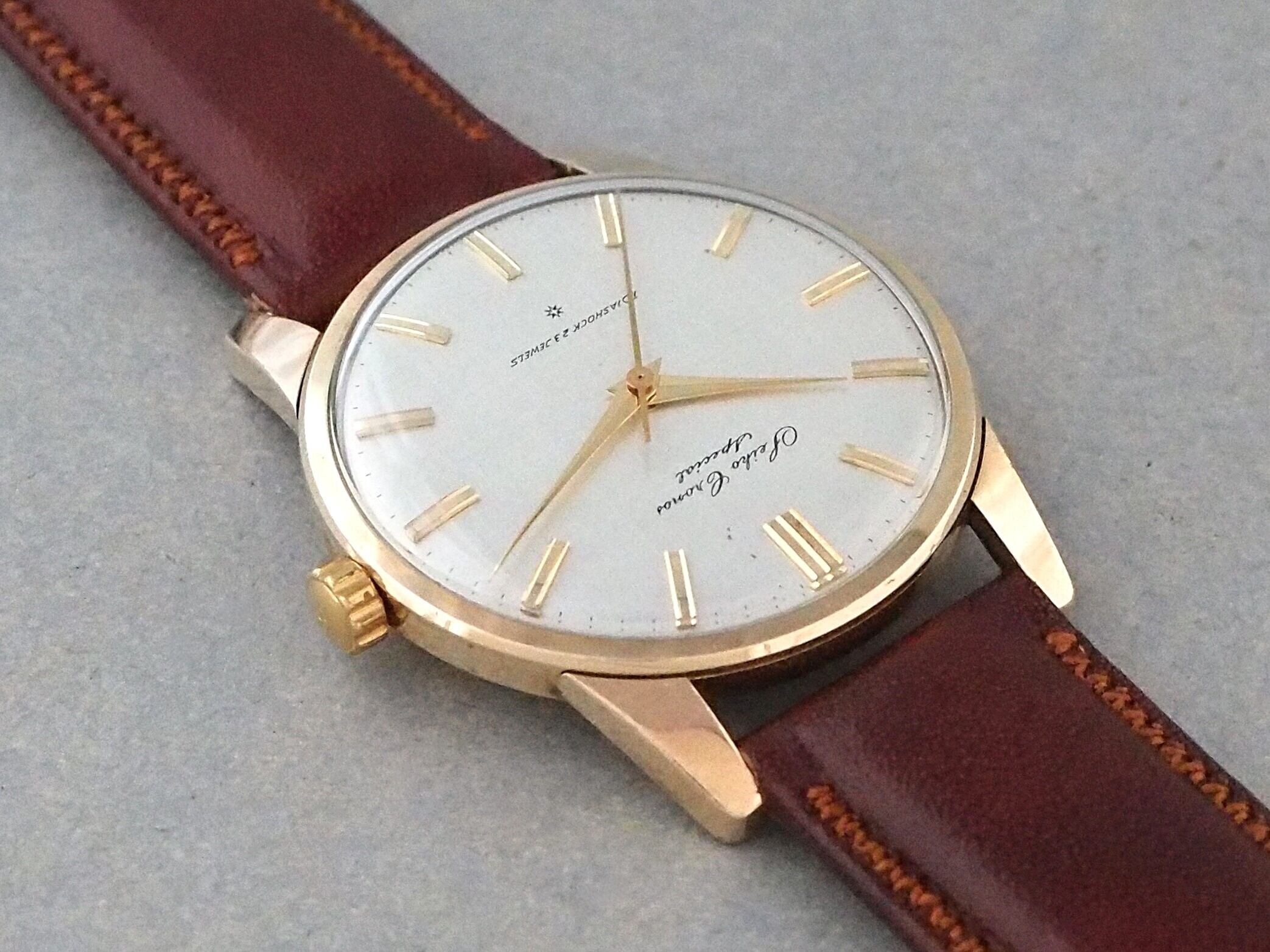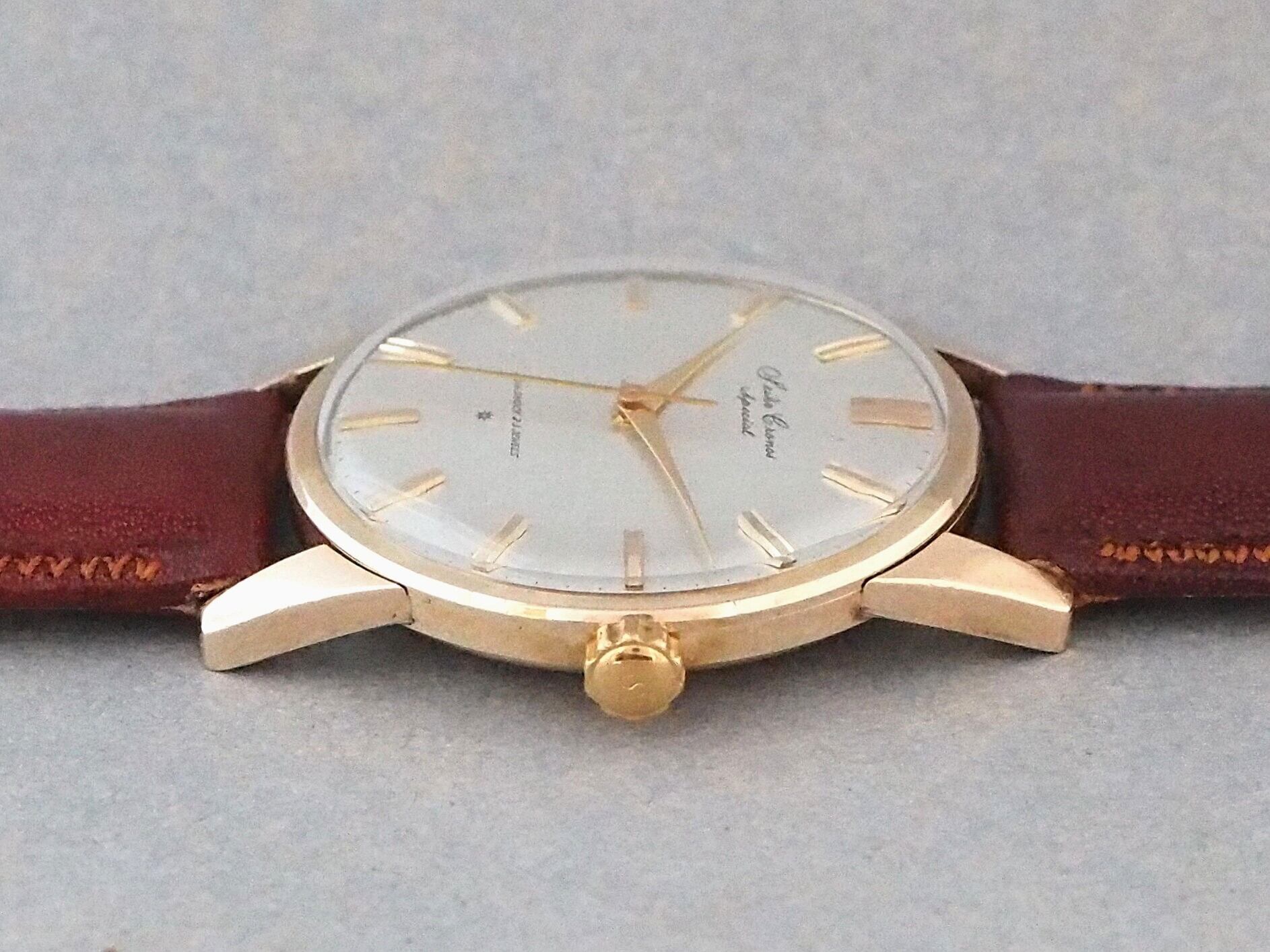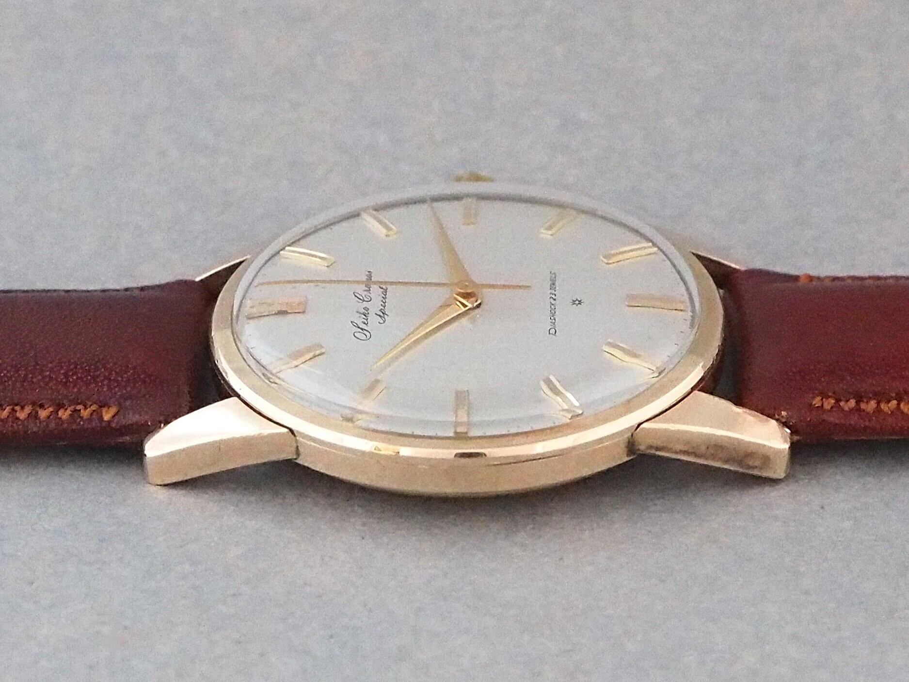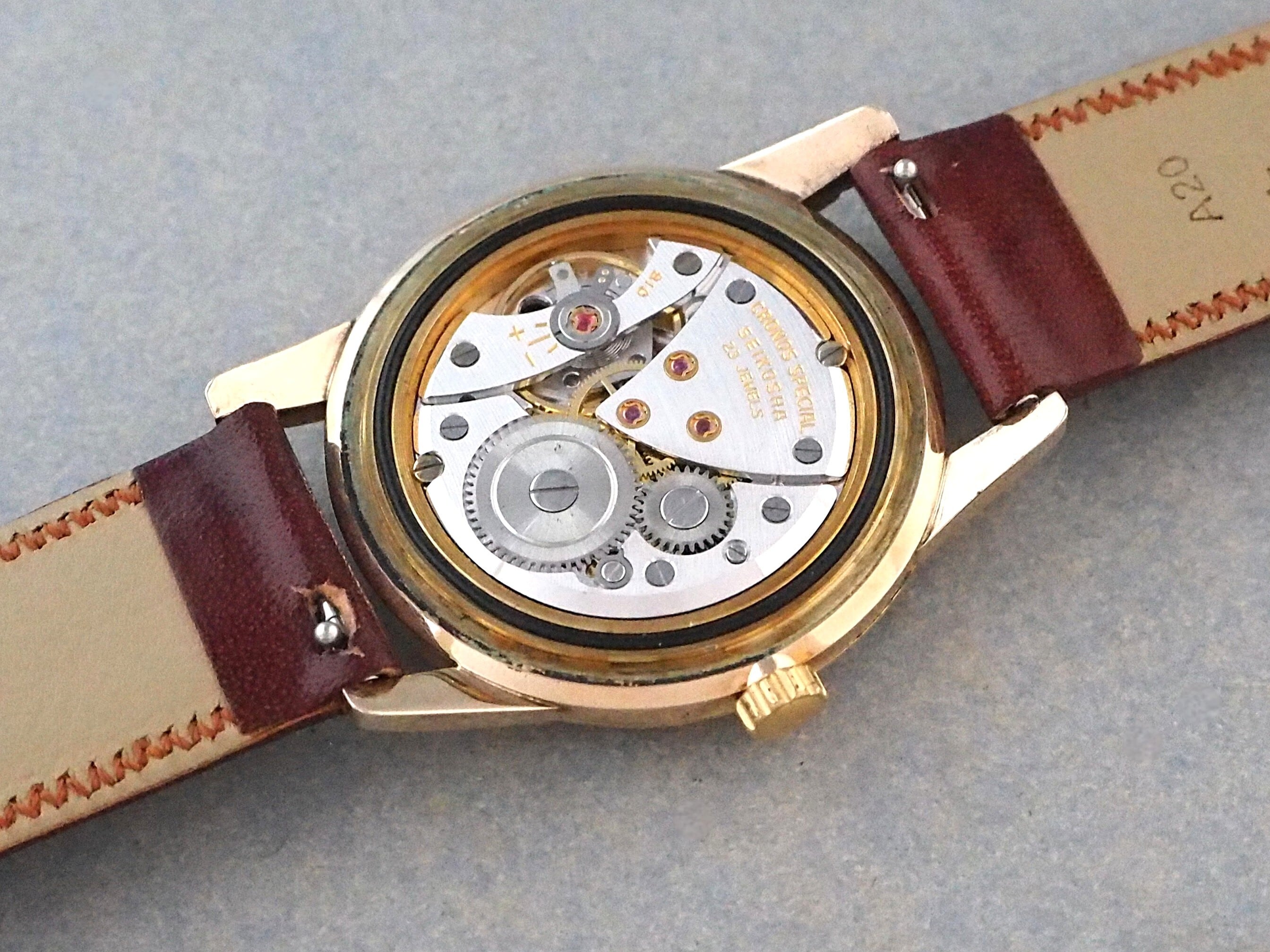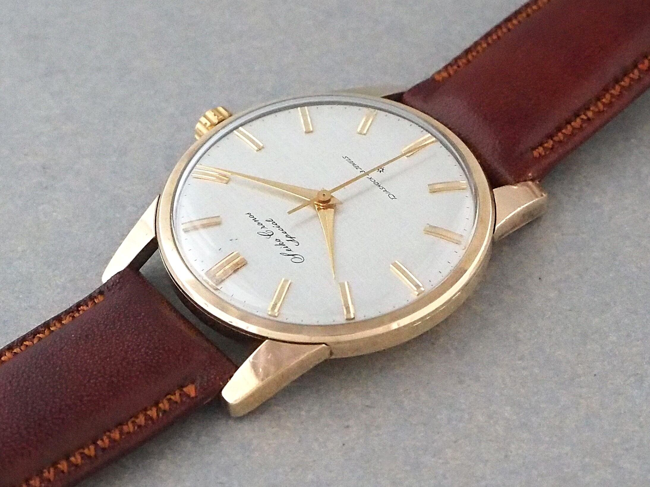 高級機に迫るモデルに相応しく、当時としてはやや大ぶりな36mm径のサイズに、存在感のあるラグをもつケースには80ミクロンの厚手の金張りが施され、文字盤6時側に記された星マーク(SDマーク)は、植字部分に18Kもしくは14K無垢が使用されていることを表しています。