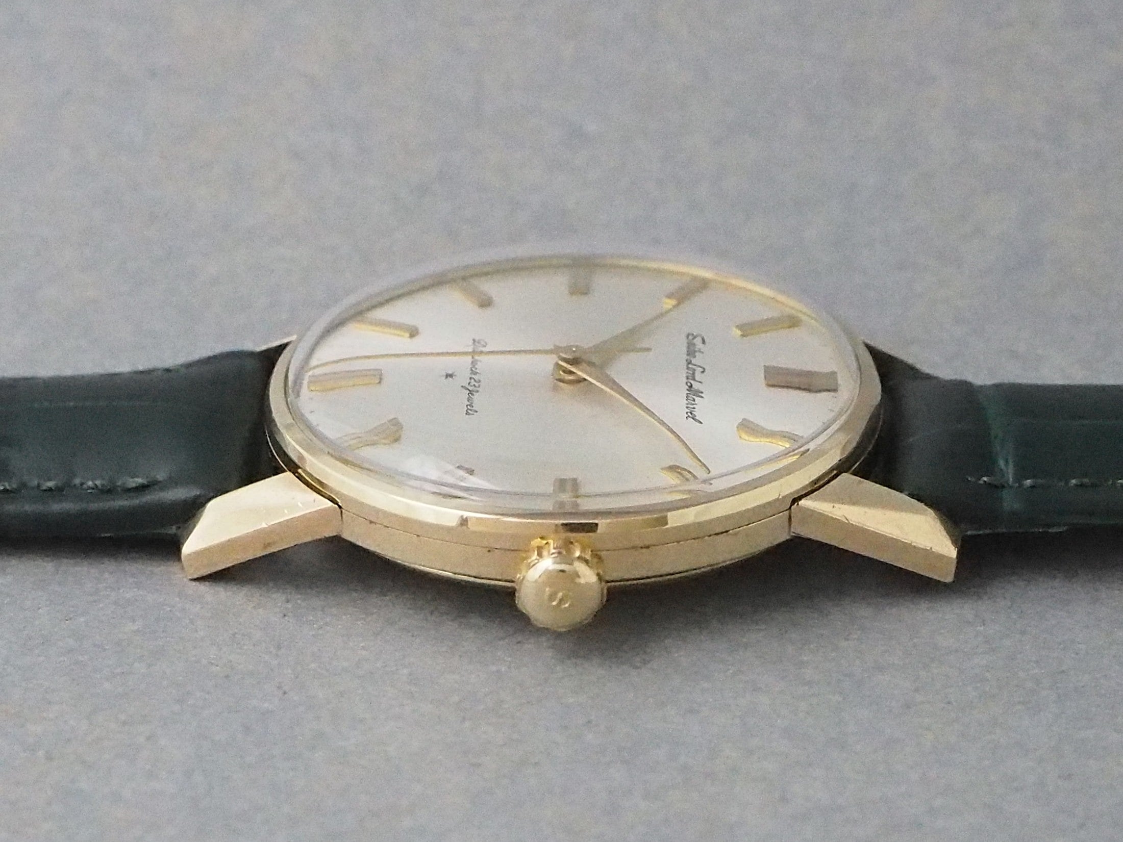 長い製造期間の中で様々なバリエーションが存在する中、「SEIKO」のロゴがなく、筆記体でブランド名とモデル名を記しているのは初期のもので、シンプルさの中にも当時の高級機らしい風格ある仕上がりが感じられます。