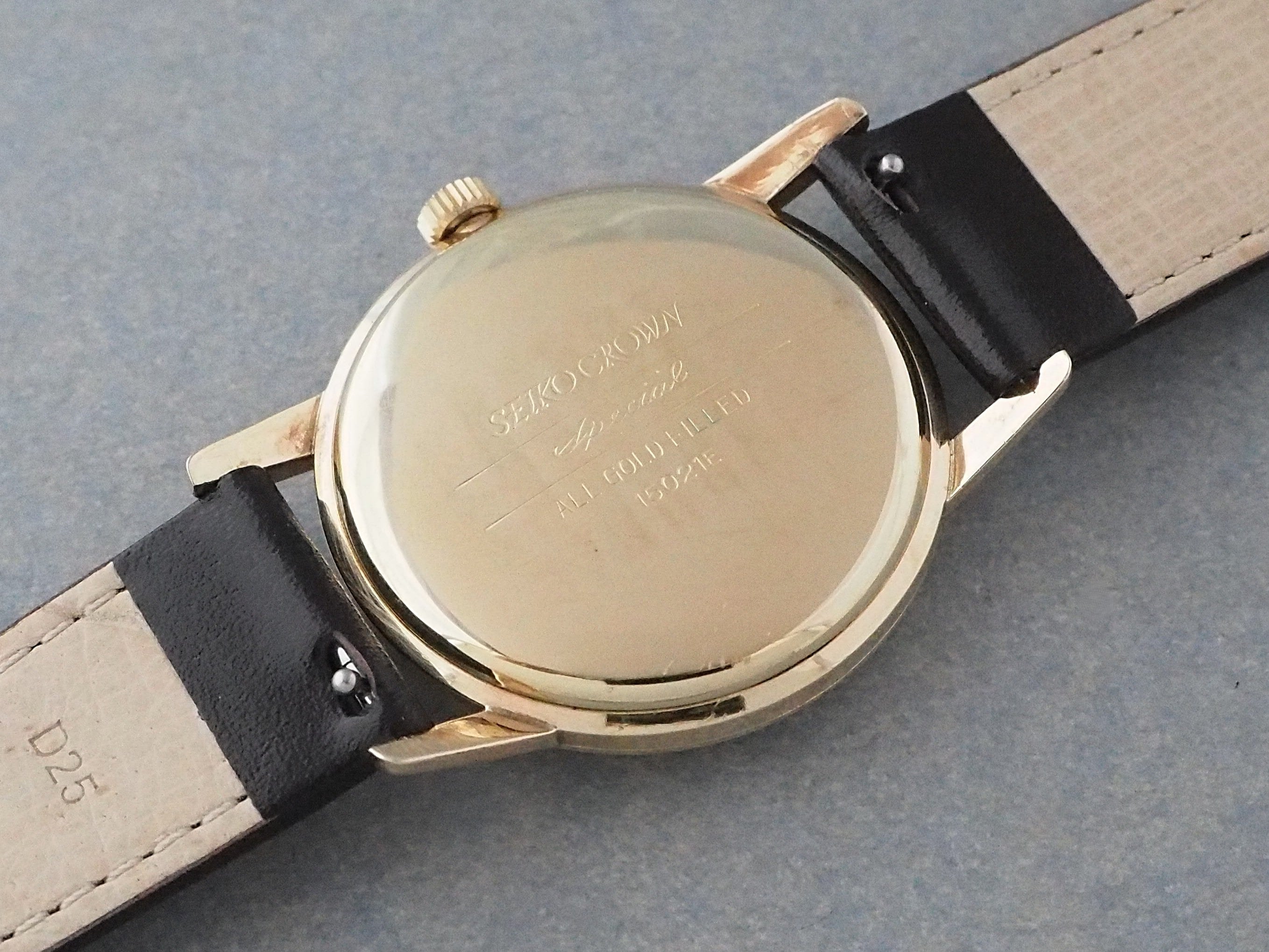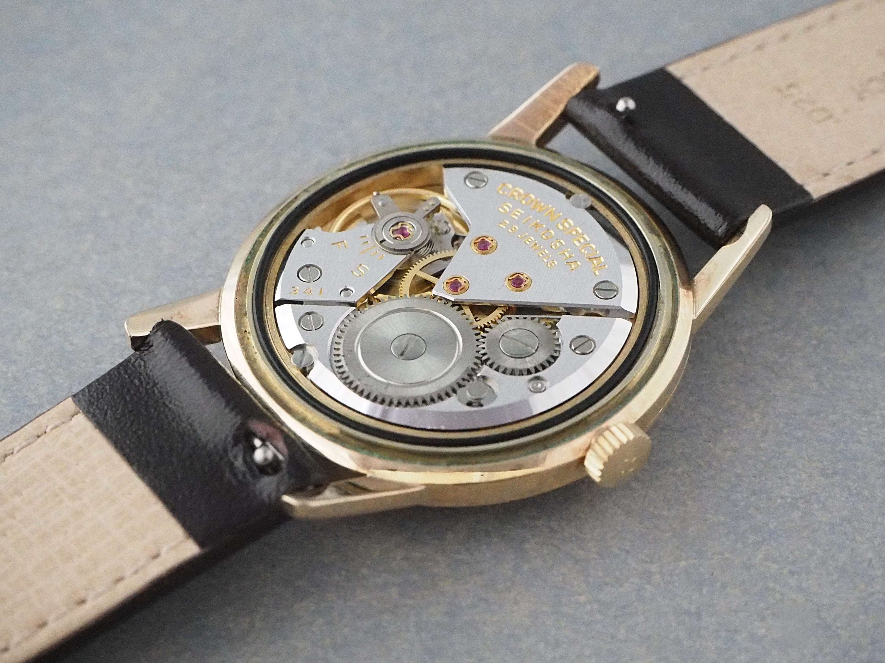 ムーブメントはクラウンというよりも最高級機として先に発売された初代グランドセイコーに近しい造りになっています。それまでのクラウンよりも受け石数を増やした23石仕様や秒針停止機能を備え、一つ一つ丁寧に磨かれた部品からも高級機としての拘りが垣間見えます。