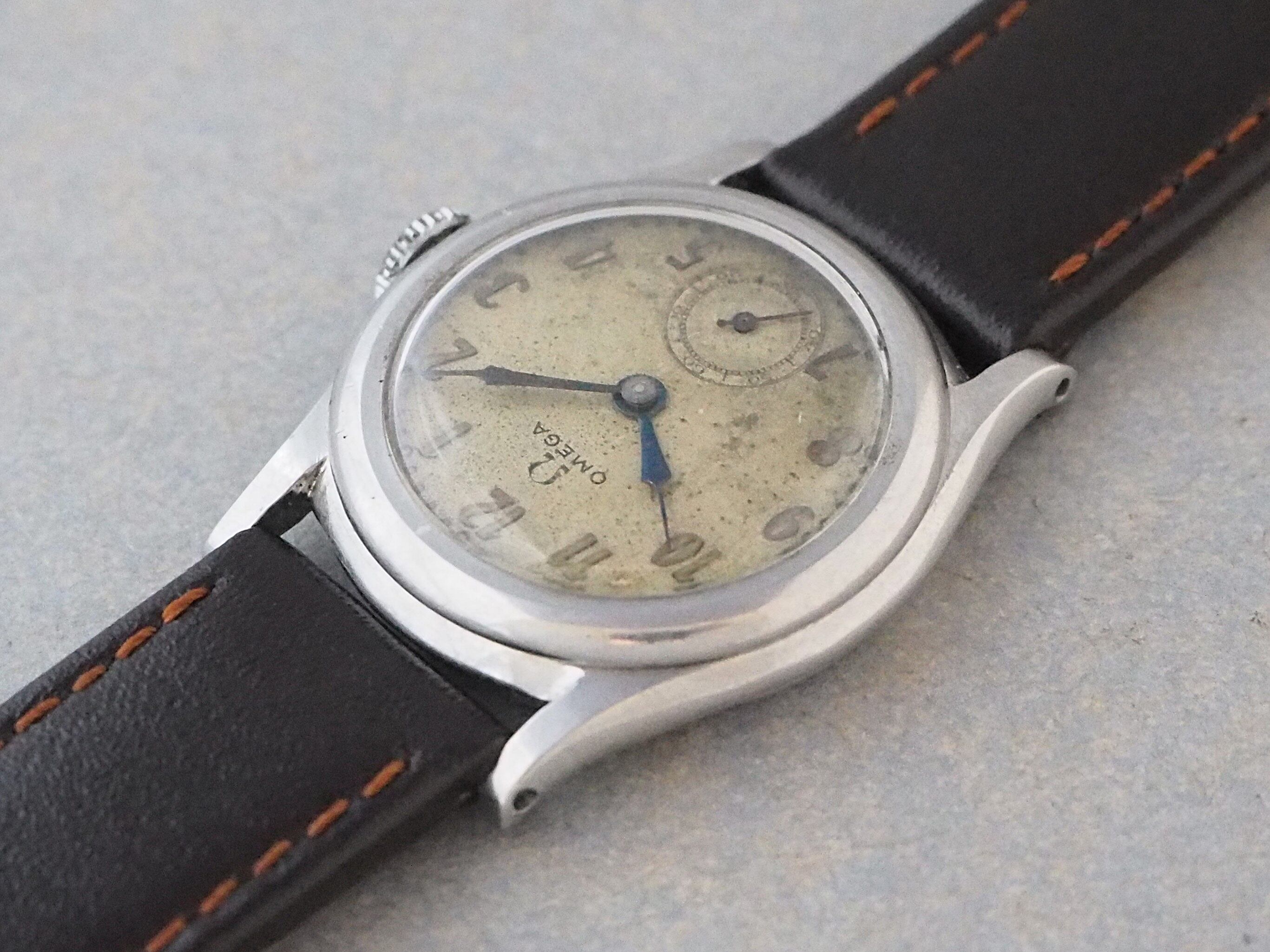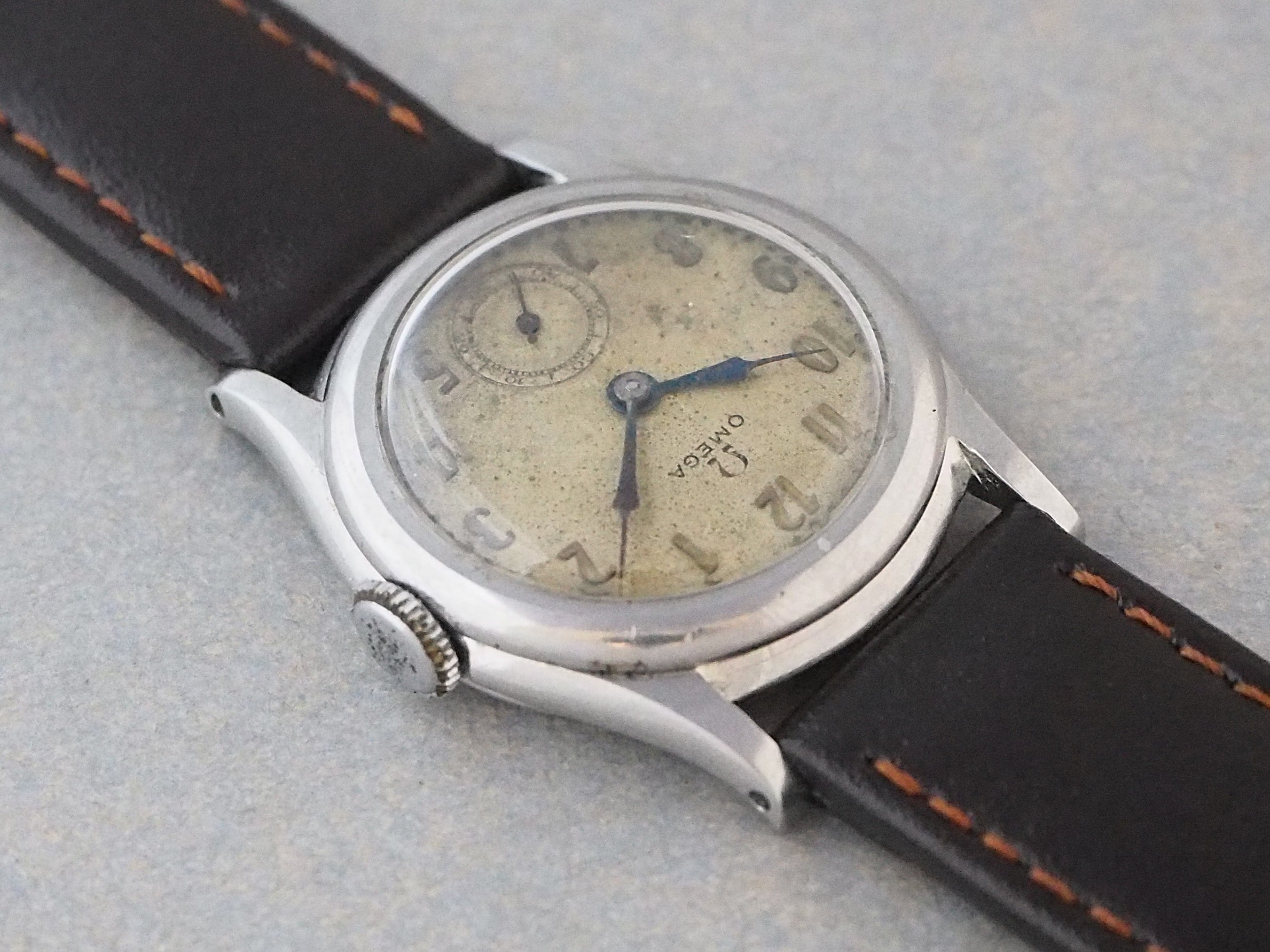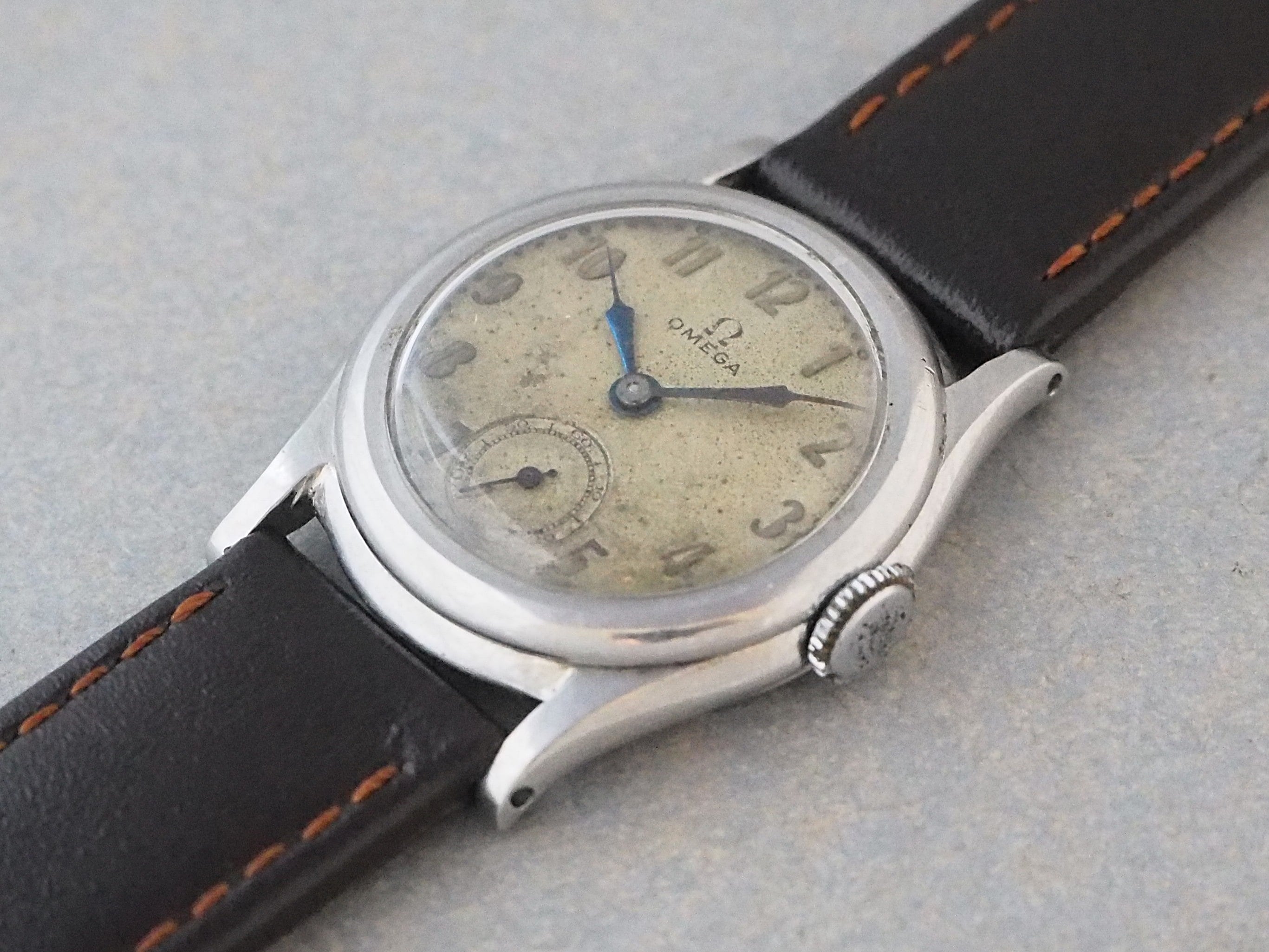 フェイスは、アラビア数字インデックス、独特な形状のブルースチールの長短針にスモールセコンドと当時の雰囲気が漂うデザインです。ケース径30mmほどの小ぶりサイズに、経年による文字盤の風合いが重なり、自然に滲むビンテージらしい佇まいとなっています。