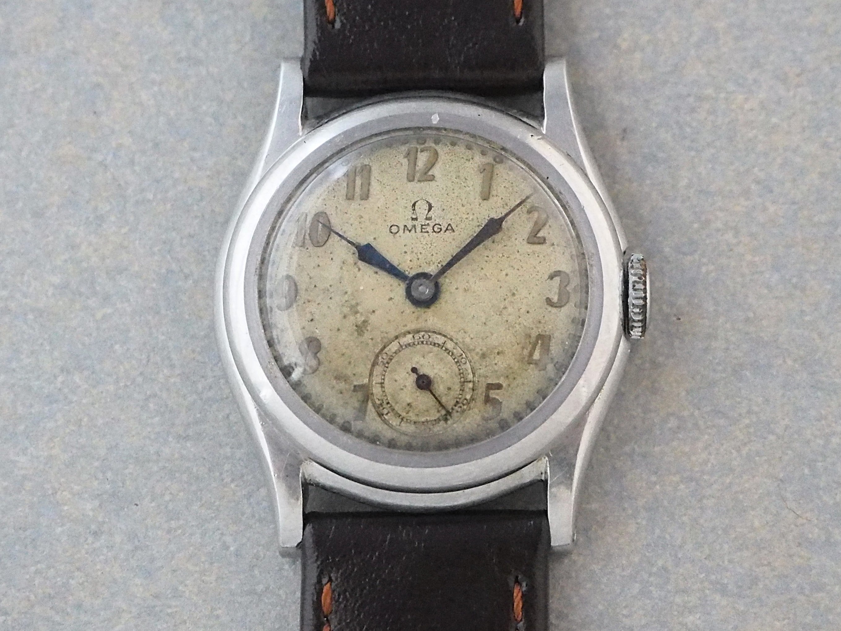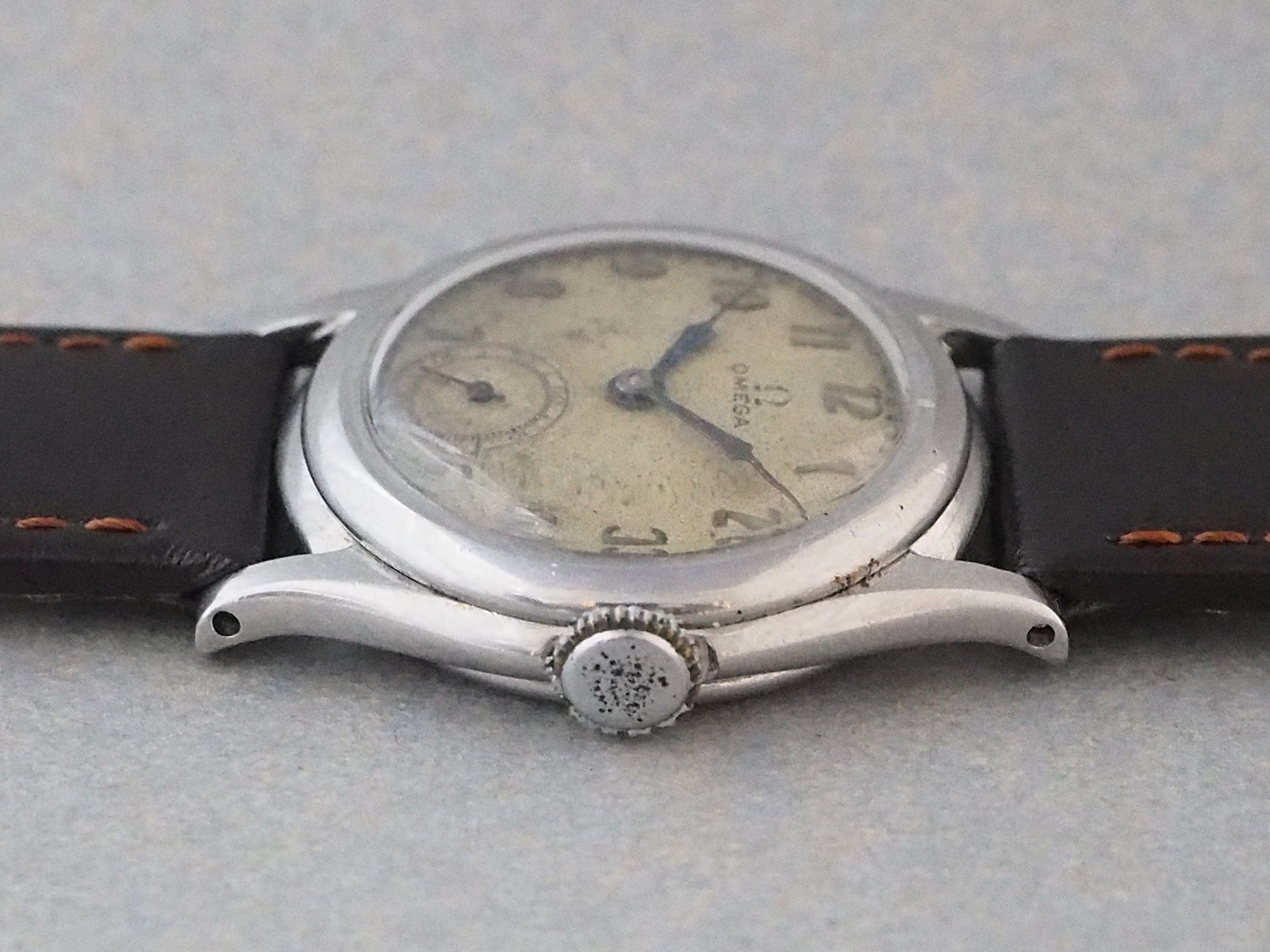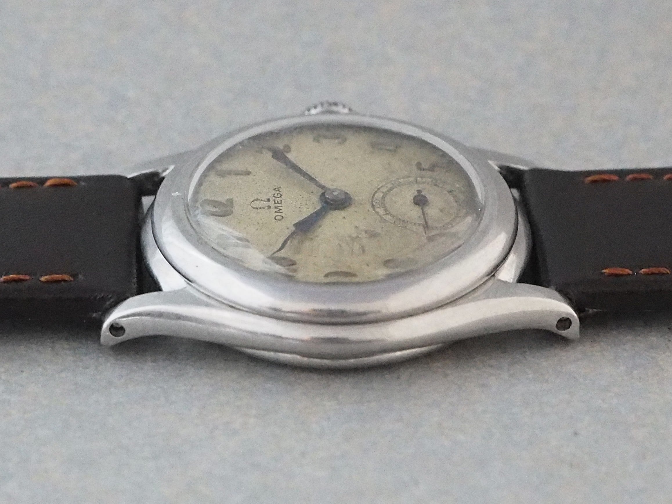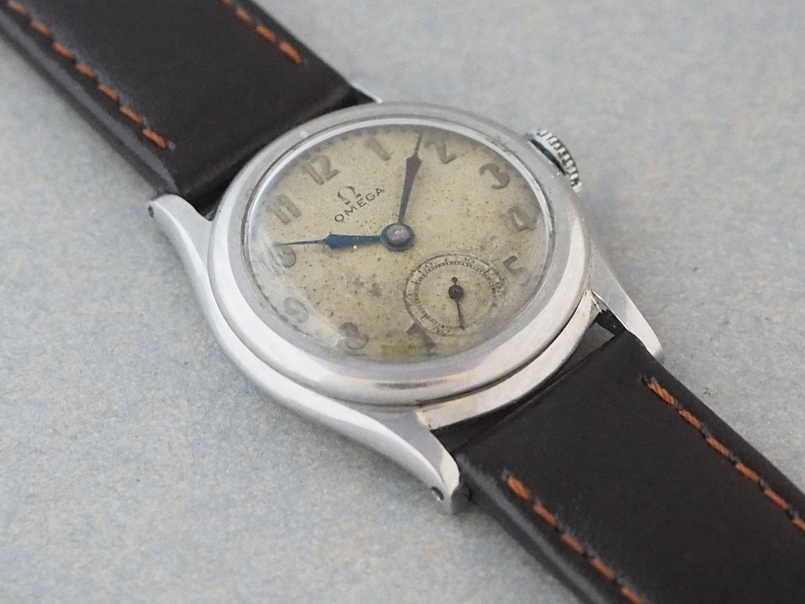 フェイスは、アラビア数字インデックス、独特な形状のブルースチールの長短針にスモールセコンドと当時の雰囲気が漂うデザインです。ケース径30mmほどの小ぶりサイズに、経年による文字盤の風合いが重なり、自然に滲むビンテージらしい佇まいとなっています。