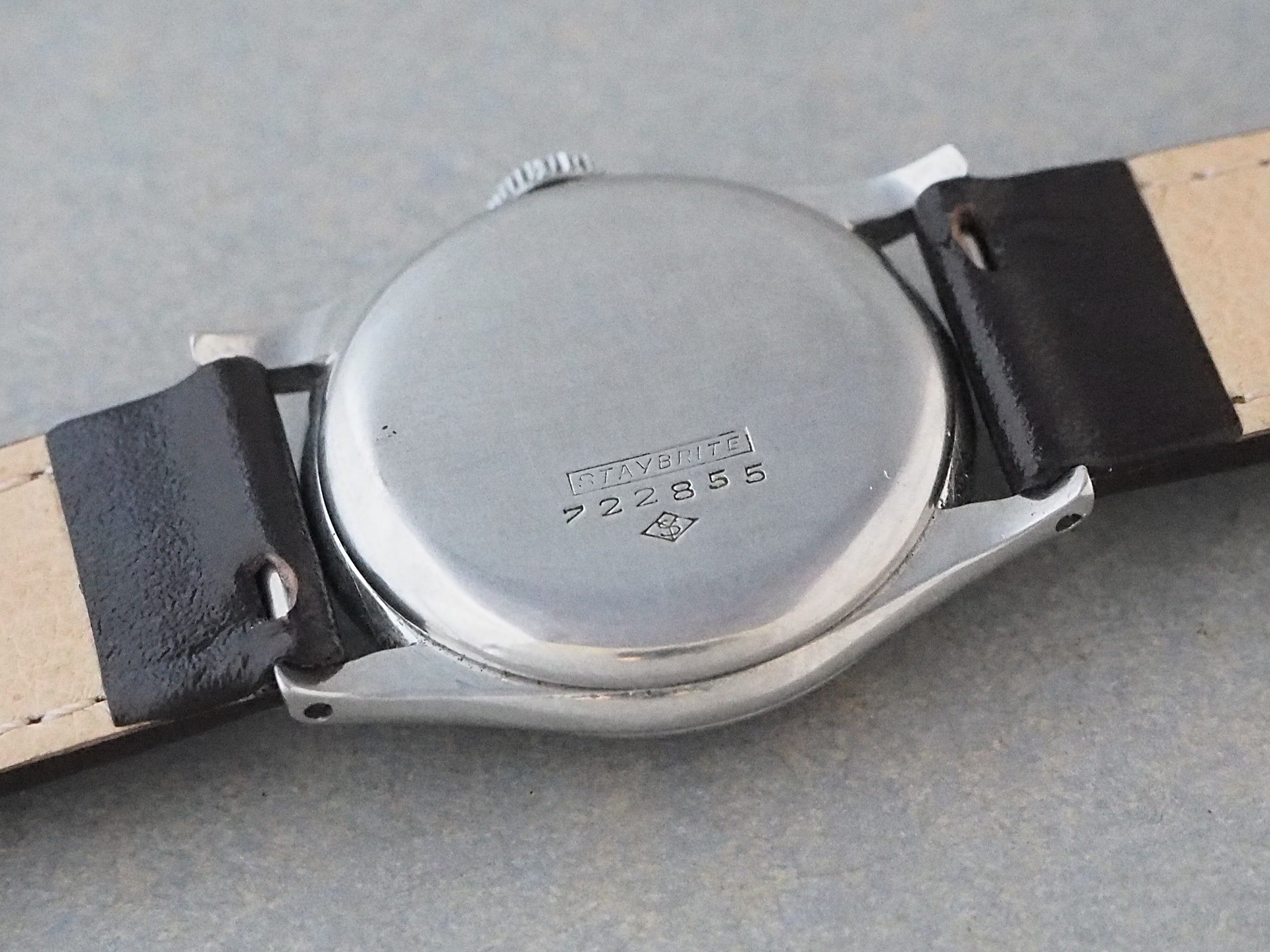 また、裏蓋には1920〜40年代の時計ケースに多く使われていた耐食性鋼材(ステンレス系素材)を示す「Staybrite」の刻印があり、このディテールも当時らしさを感じさせるポイントです。