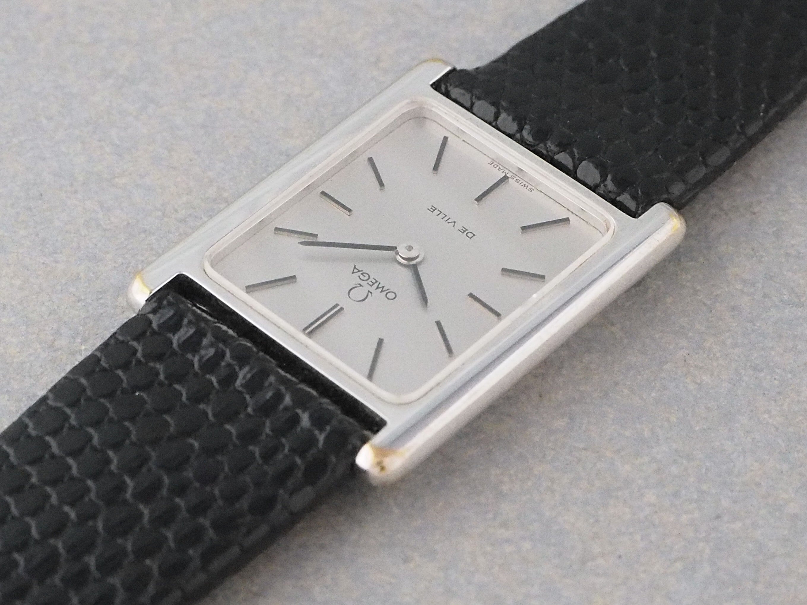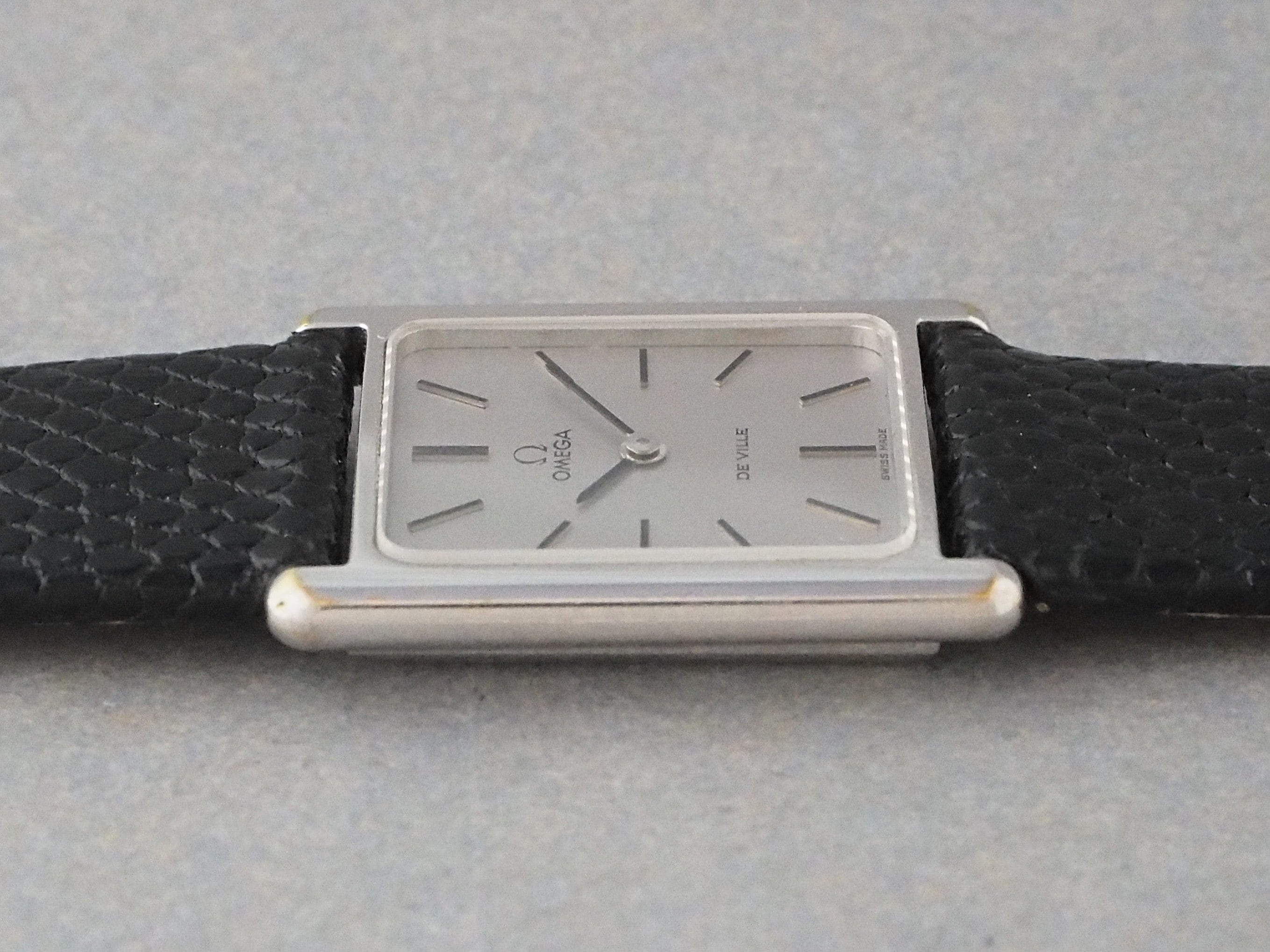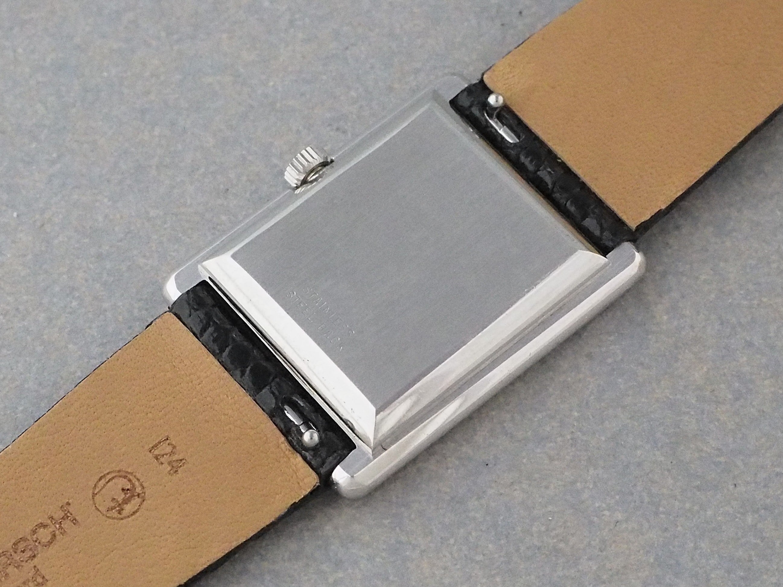 ラグの先端部分にメッキ剥がれが見られますが、滑らかな状態のため全体の雰囲気を損なうほどではありません。幅24.5mmと小ぶりながら、角形ならではの存在感と太めのベルトとの組み合わせが手元に程よい存在感を与え、女性はもちろん、小ぶりなサイズを好む男性にもおすすめです。