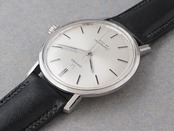 全体的に端正さが引き立つ良好なコンディションで、文字盤は針・インデックスともに光沢を保っています。ワンピースケースは小ぶりなケース径34.5mm、厚さも9mm弱と、ノンデイトの手巻きモデルならではのスッキリと腕元に収まるサイズ感です。