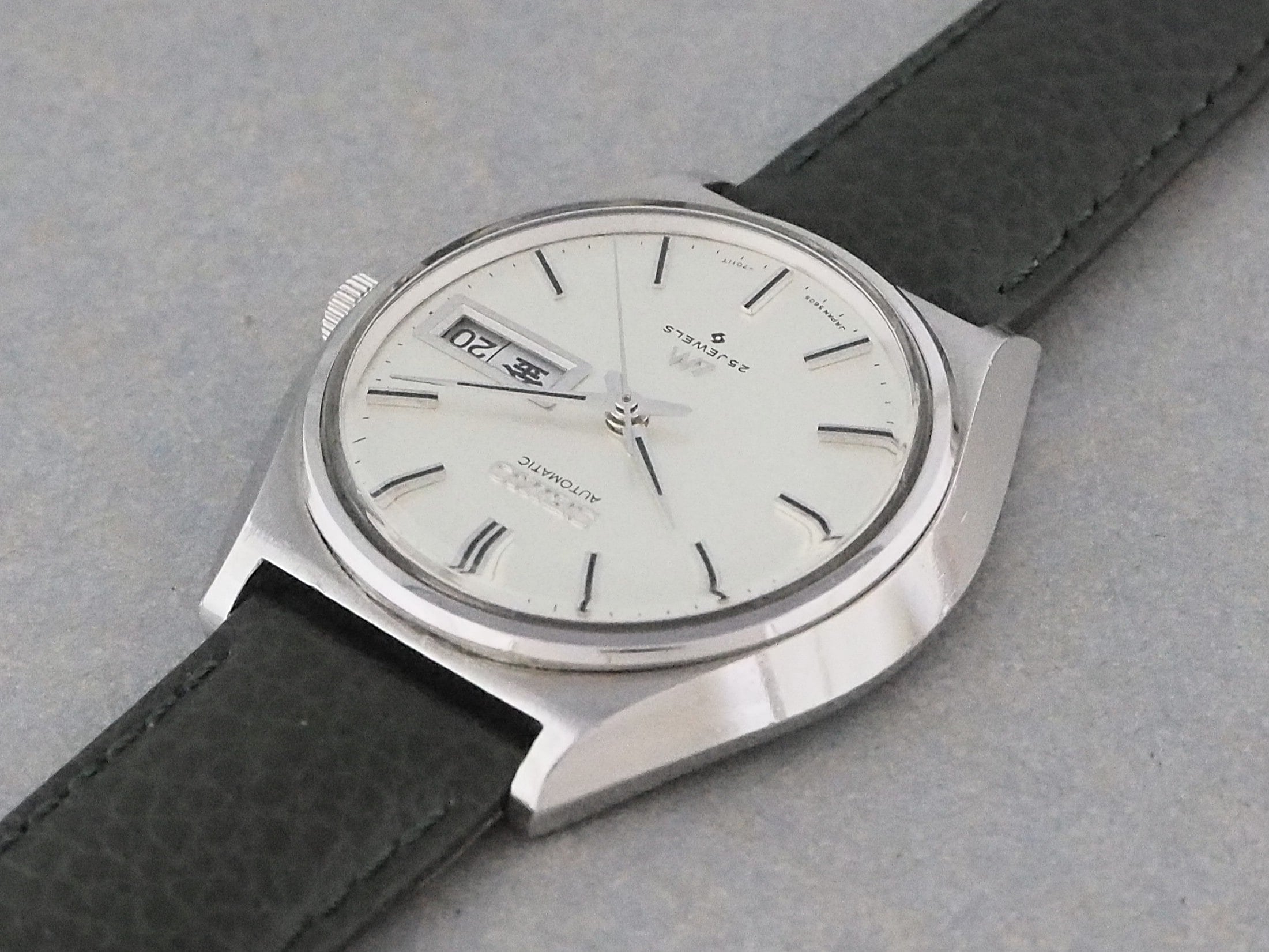 ケースには多少の小傷がありますが自然な風合いで、フェイスは美しい状態を保っています。プラスティック風防には経年による摩耗が見られるものの、全体の雰囲気や視認性に影響はなく、国産ビンテージウォッチを十分に楽しめる良好なコンディションです。