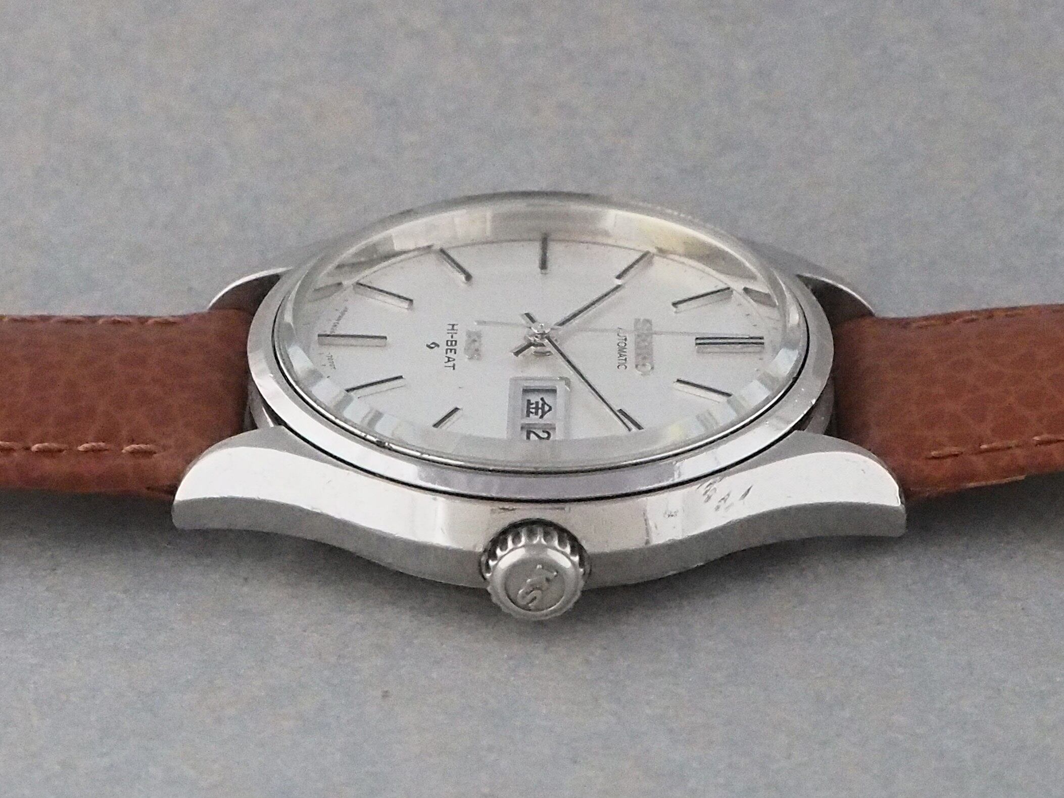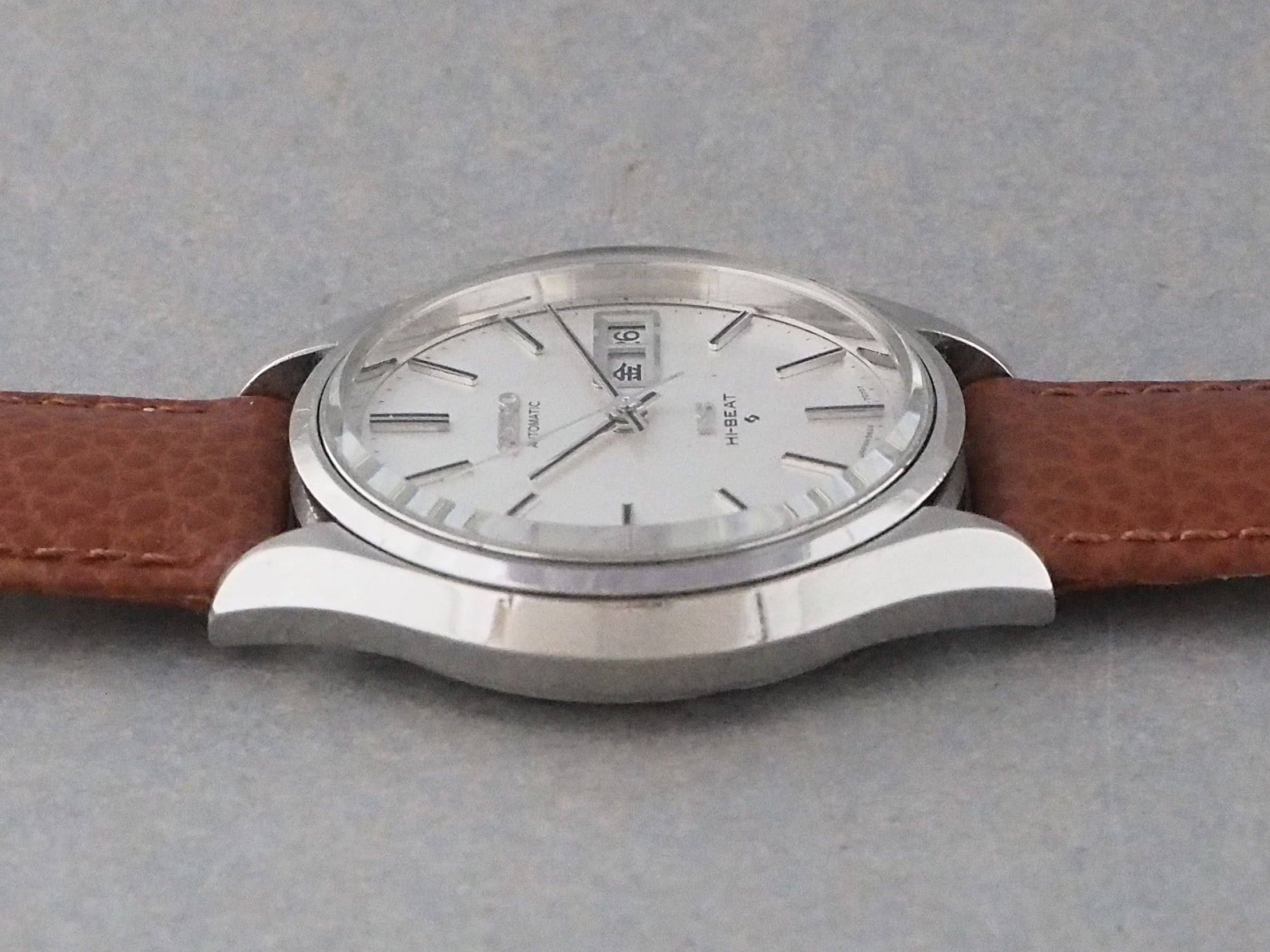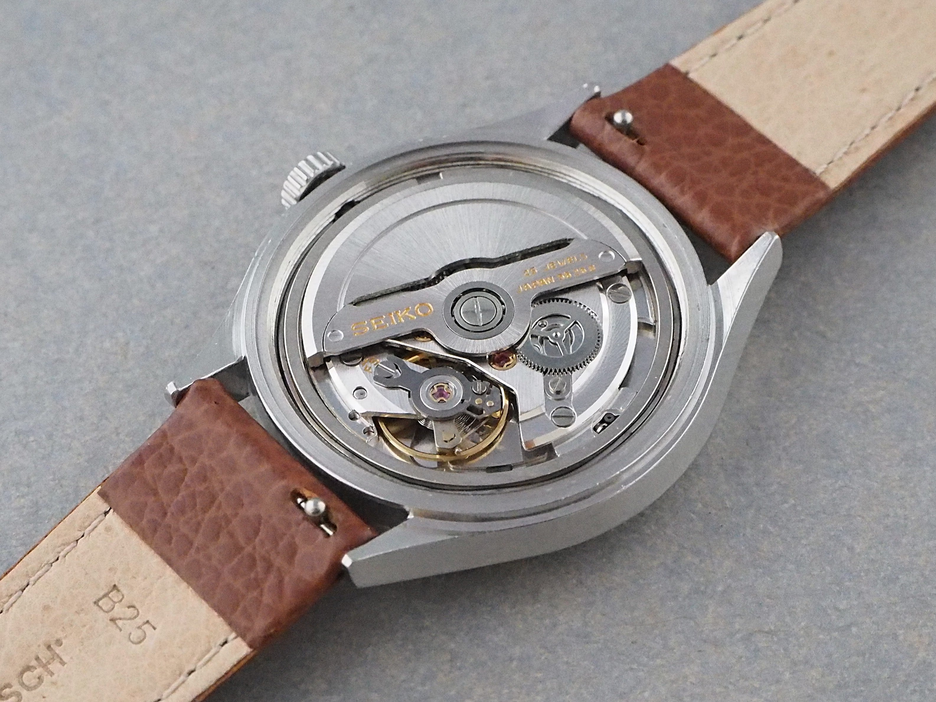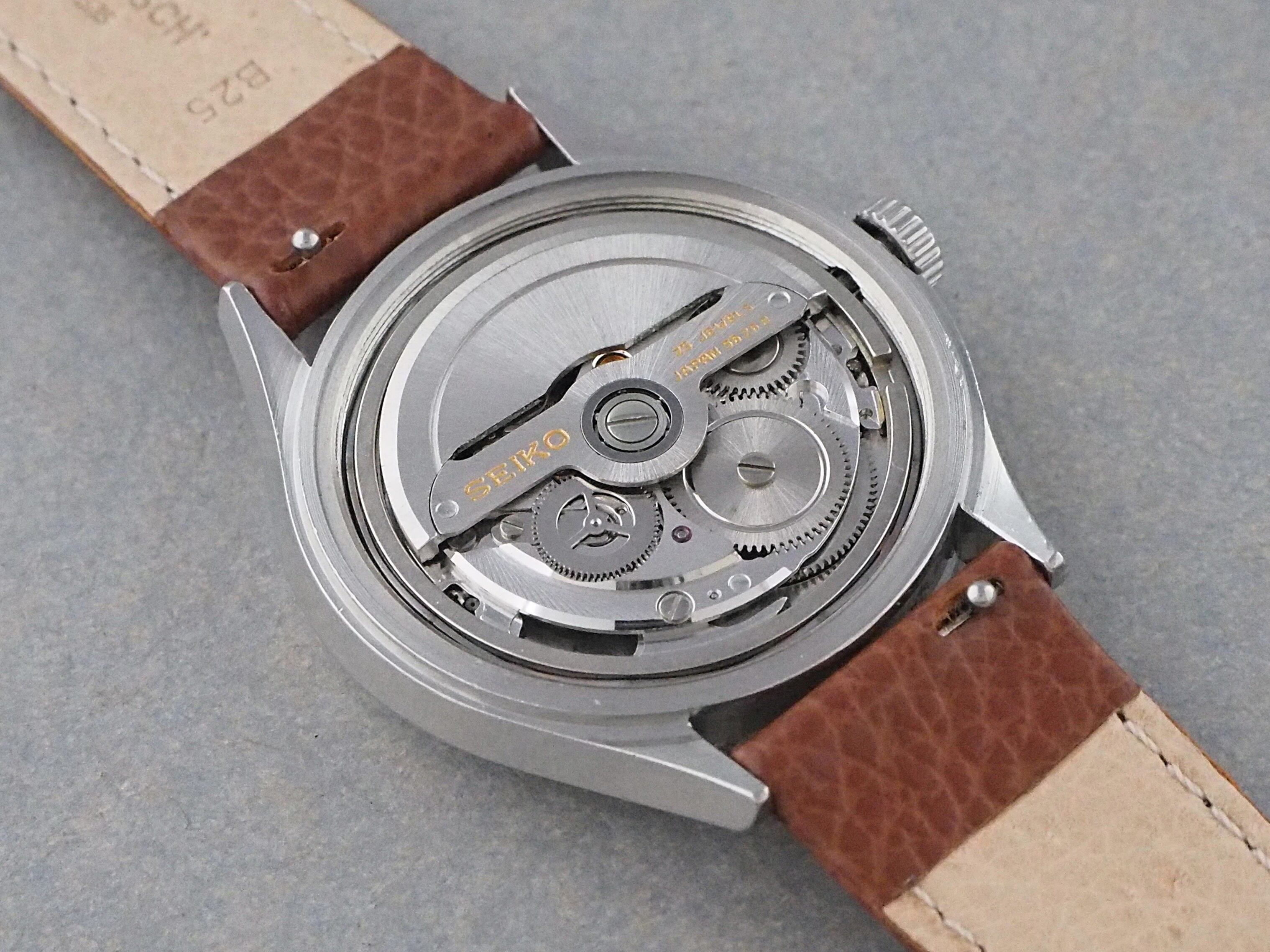 文字盤外周部にわずかな汚れが見られ、ケース2時位置側面に多少目立つキズがありますが、このモデルのスタイリッシュな印象を損なう程ではありません。この頃の”56KS”は、ワンピースケースも多く見られますが、こちらはスクリューバック式の裏蓋を採用しています。
