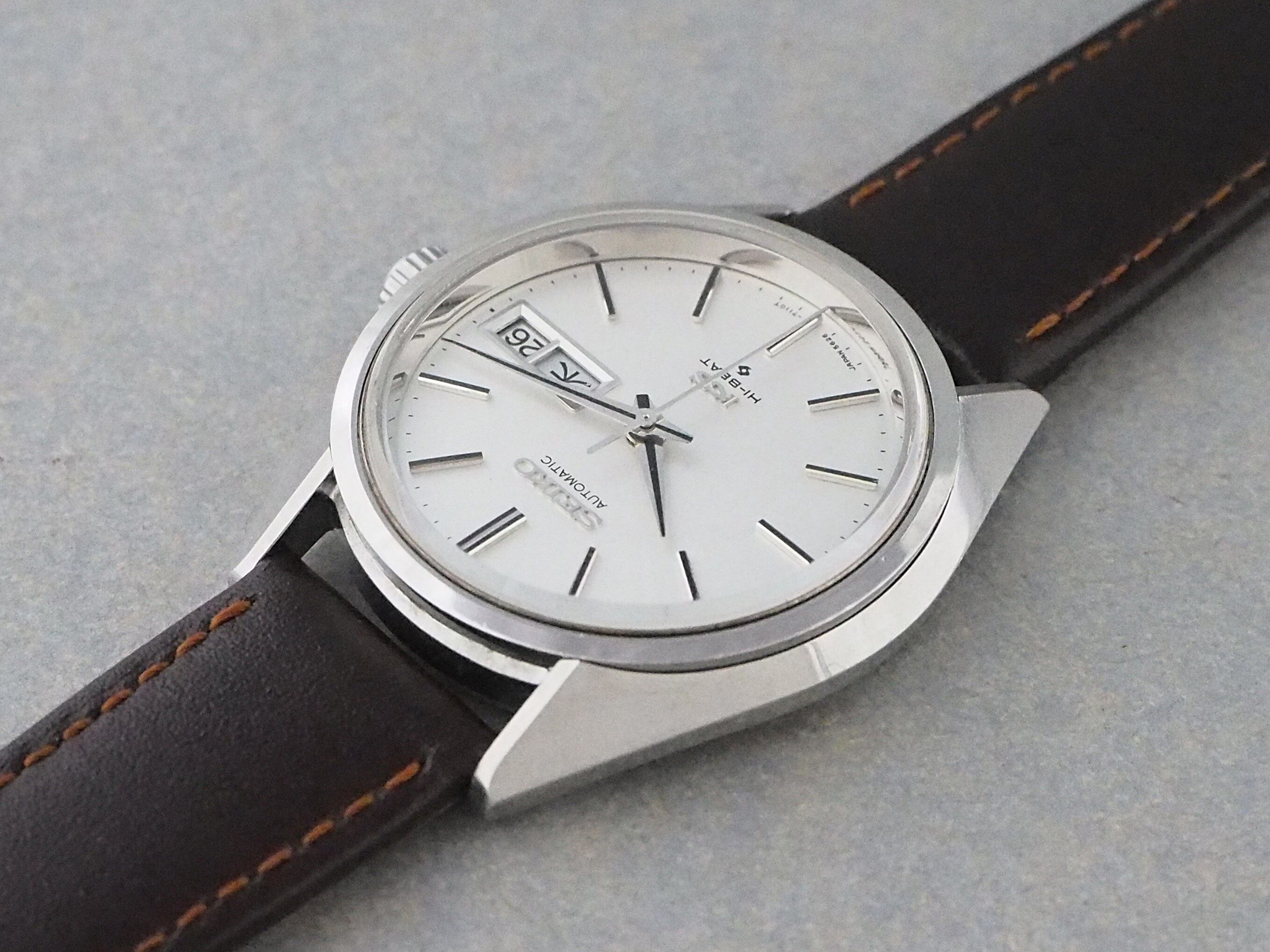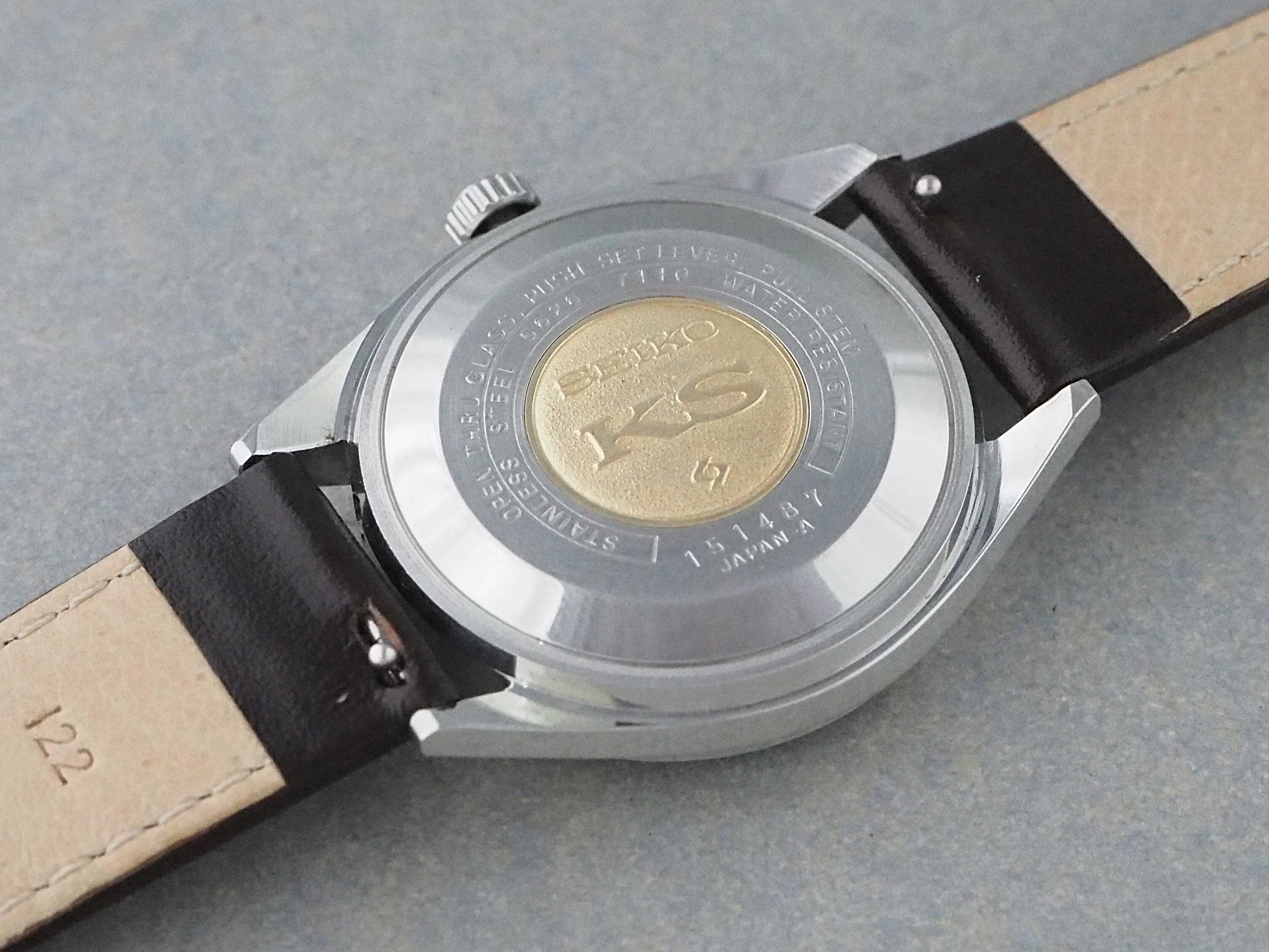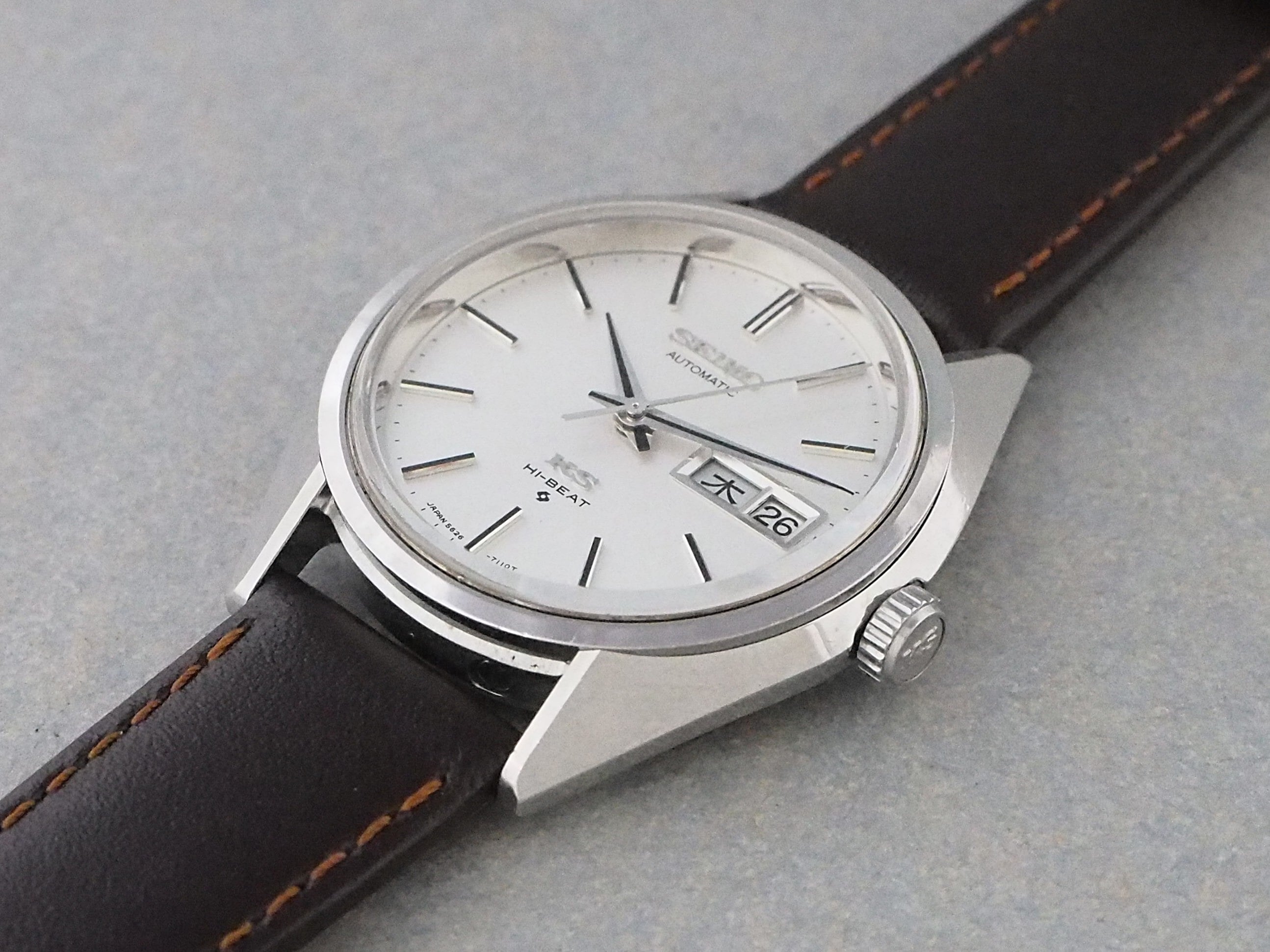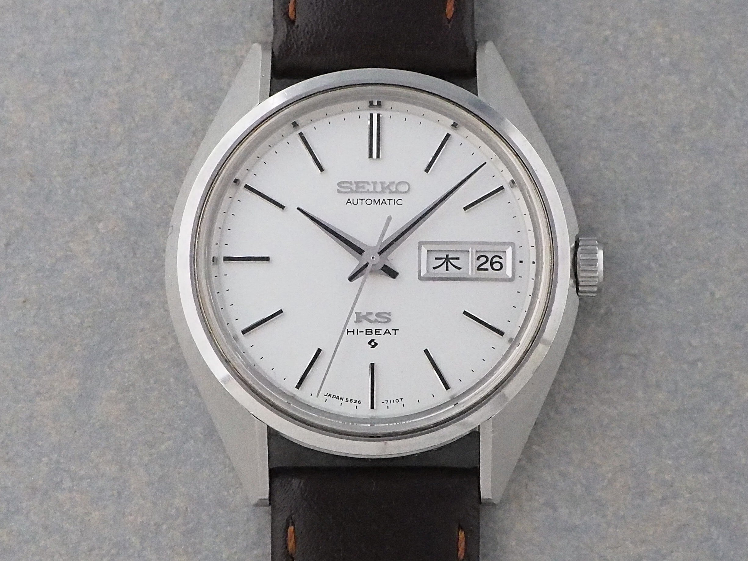 振動数28800のハイビート自動巻きムーブメント・Cal.5626は薄型で日付曜日の早送り機能を付加した、1960年代後半~70年代のセイコーの主力となった56系機械の一つです。これまでキングセイコーは亀戸工場製のみのモデルでしたが、この56系ムーブメントを搭載したキングセイコーが諏訪工場製初となったモデルでもあります。