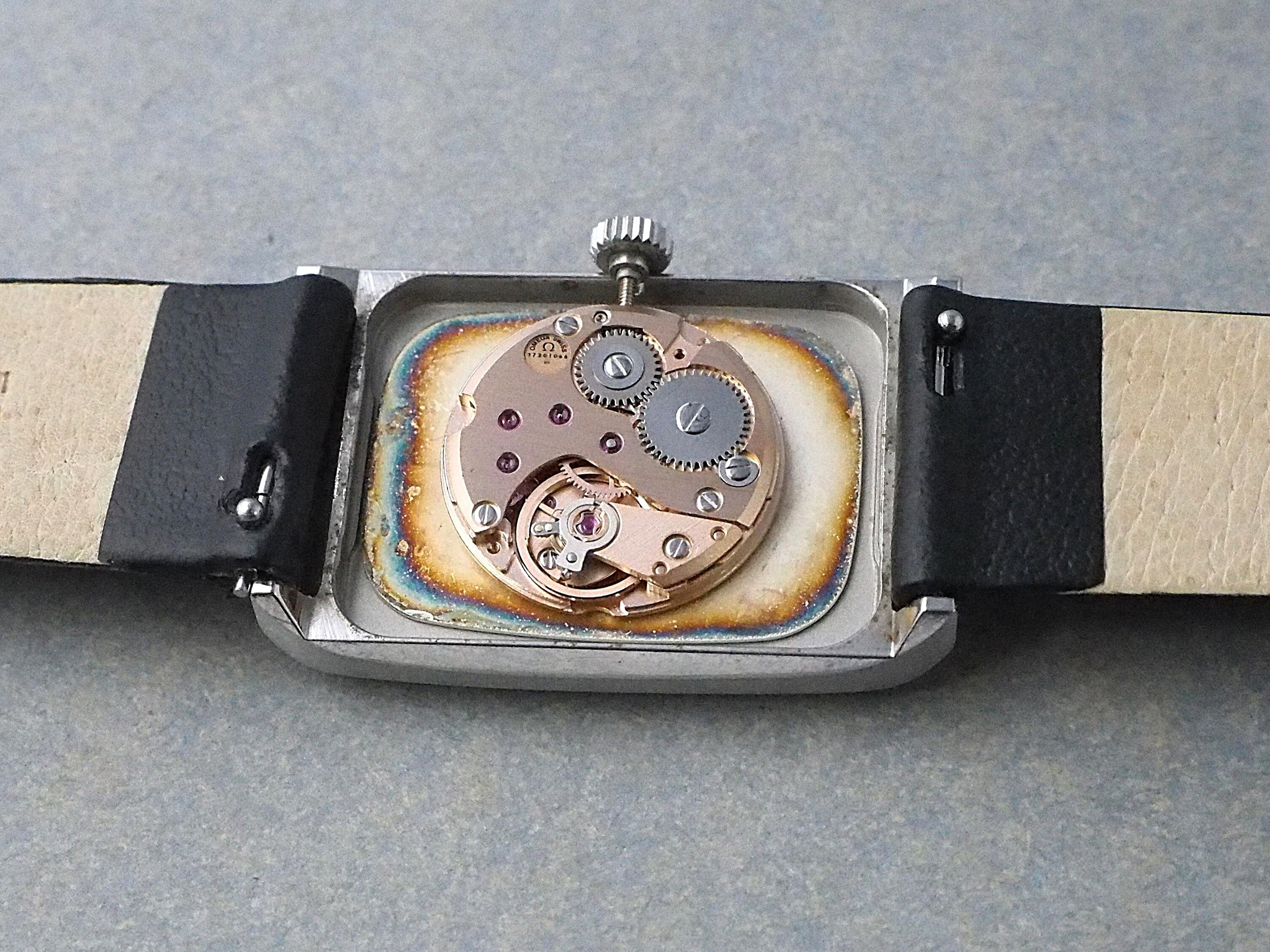 すっきりとした光沢感のある白文字盤にシャープなペンシルハンドにバーインデックスによるスマートなデザイン。文字盤に多少のクラックがみられますが、全体の雰囲気を損なうことはなく、端正でエレガントなドレスウォッチも得意とするOMEGAらしさが漂うフェイスです。