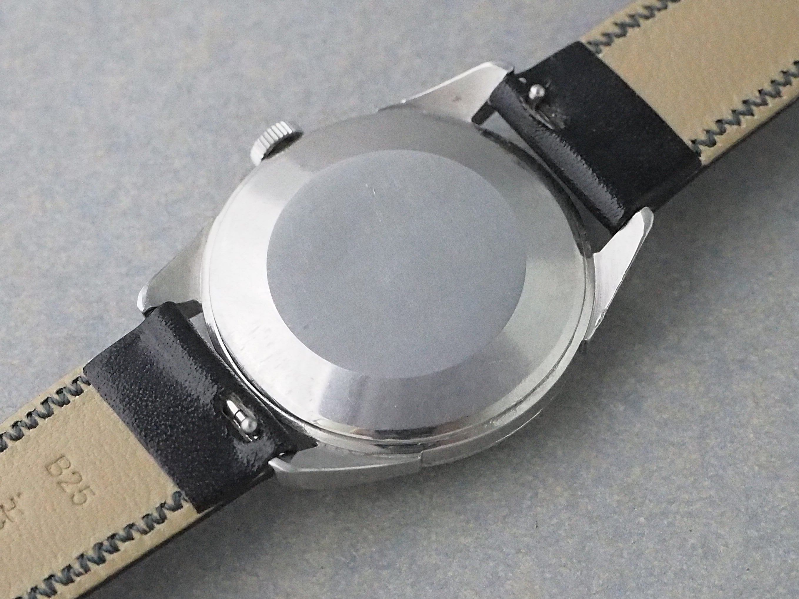 フェイスの3・6・9・12のアラビア数字とクサビインデックスにドーフィン針を組み合わせたデザインに50年代らしさが漂います。文字盤には経年によりややアイボリー調の色味へ変化し、細かなエイジングが見られますが、全体として自然なコンディションです。