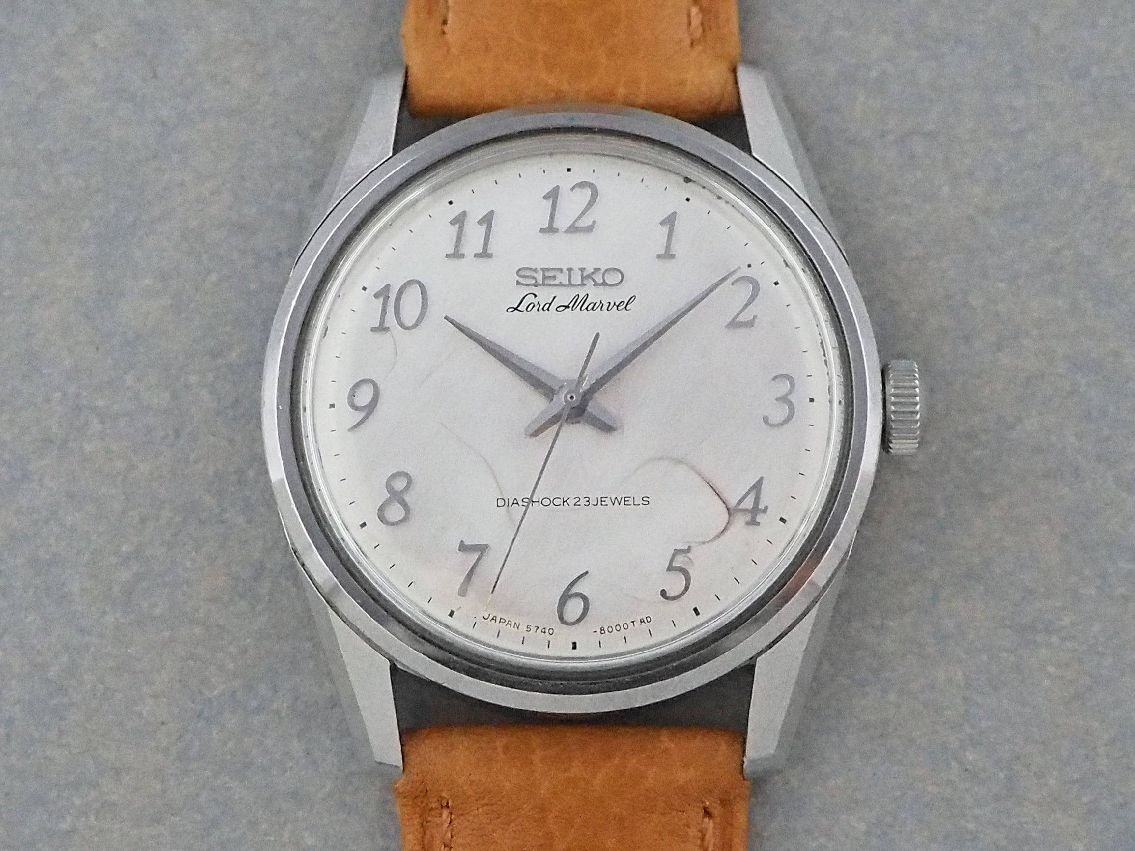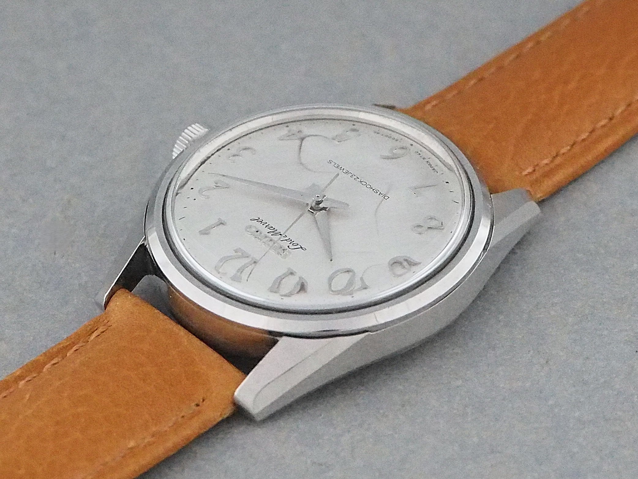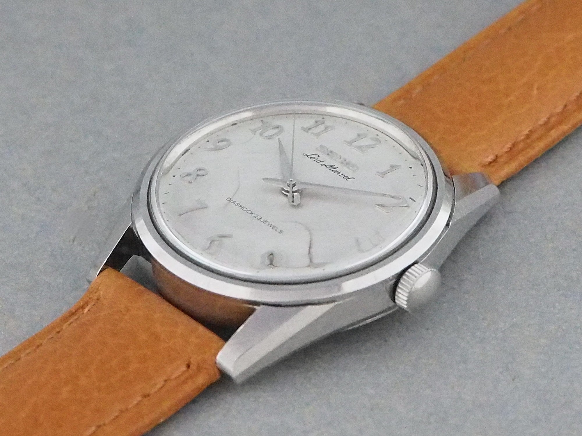 この「ロードマーベル」は、1960年代中頃に第二世代のロービートムーブメントからハイビートムーブメントへとモデル変更する過渡期に製造された希少なモデルで、アラビア数字インデックスとアップライトの「SEIKO」ロゴやケースは、後の「ロードマーベル36000」に受け継がれています。
