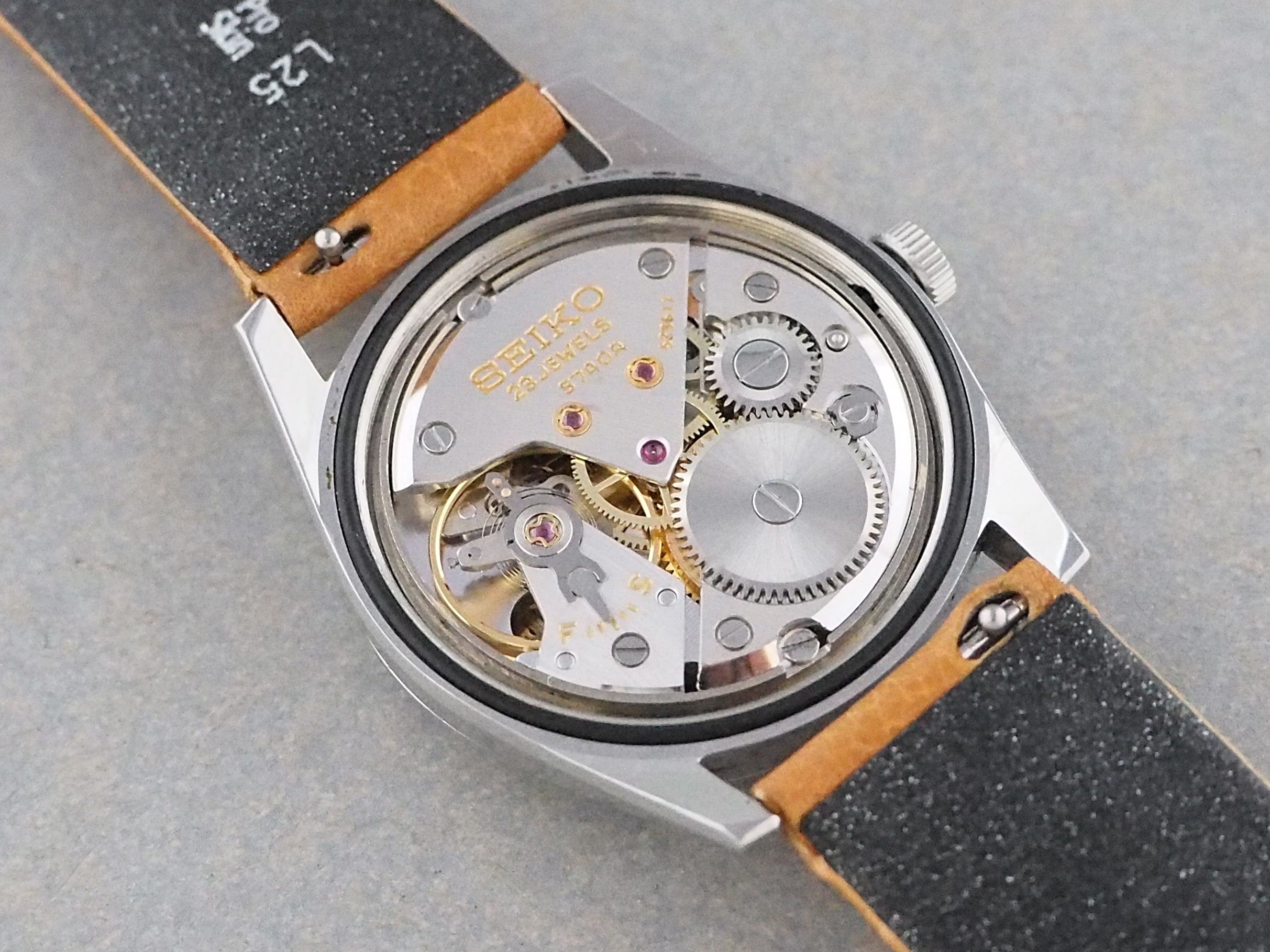 ケースはスクリューバック式で、裏蓋の「タツノオトシゴ」の刻印はこの時期のみのディテールです。使用によって薄くなっていることも多いですが、しっかり残っています。