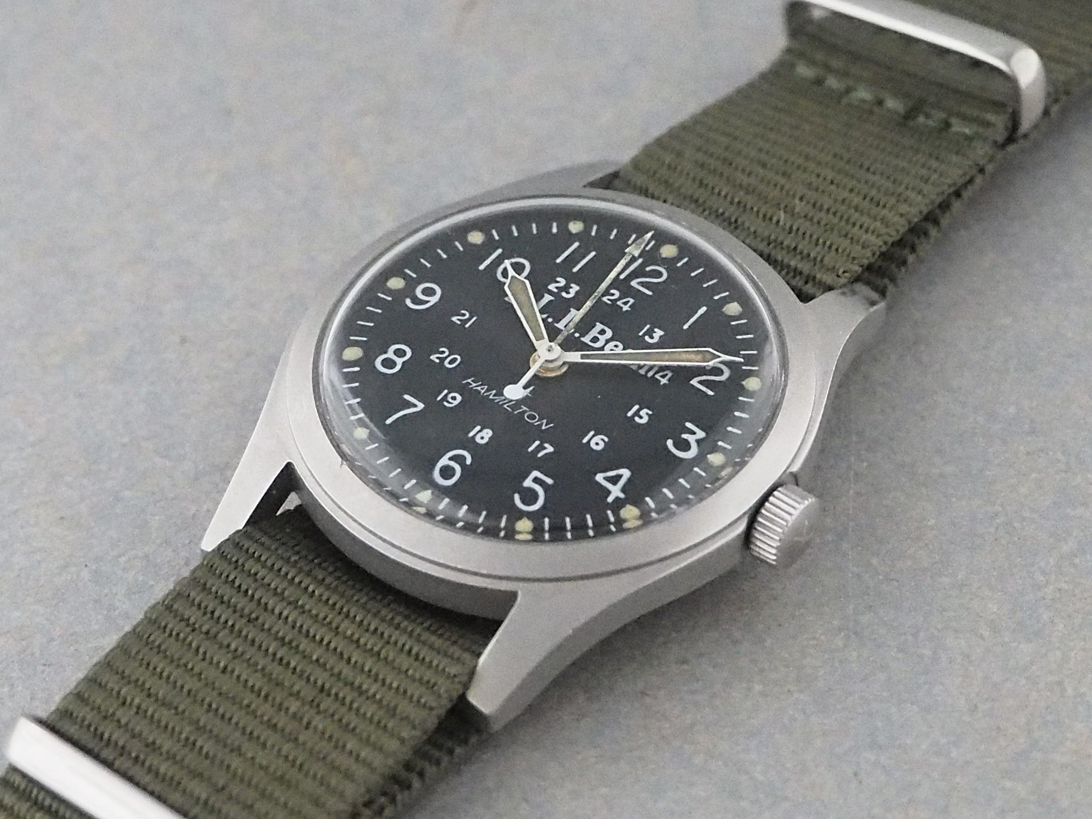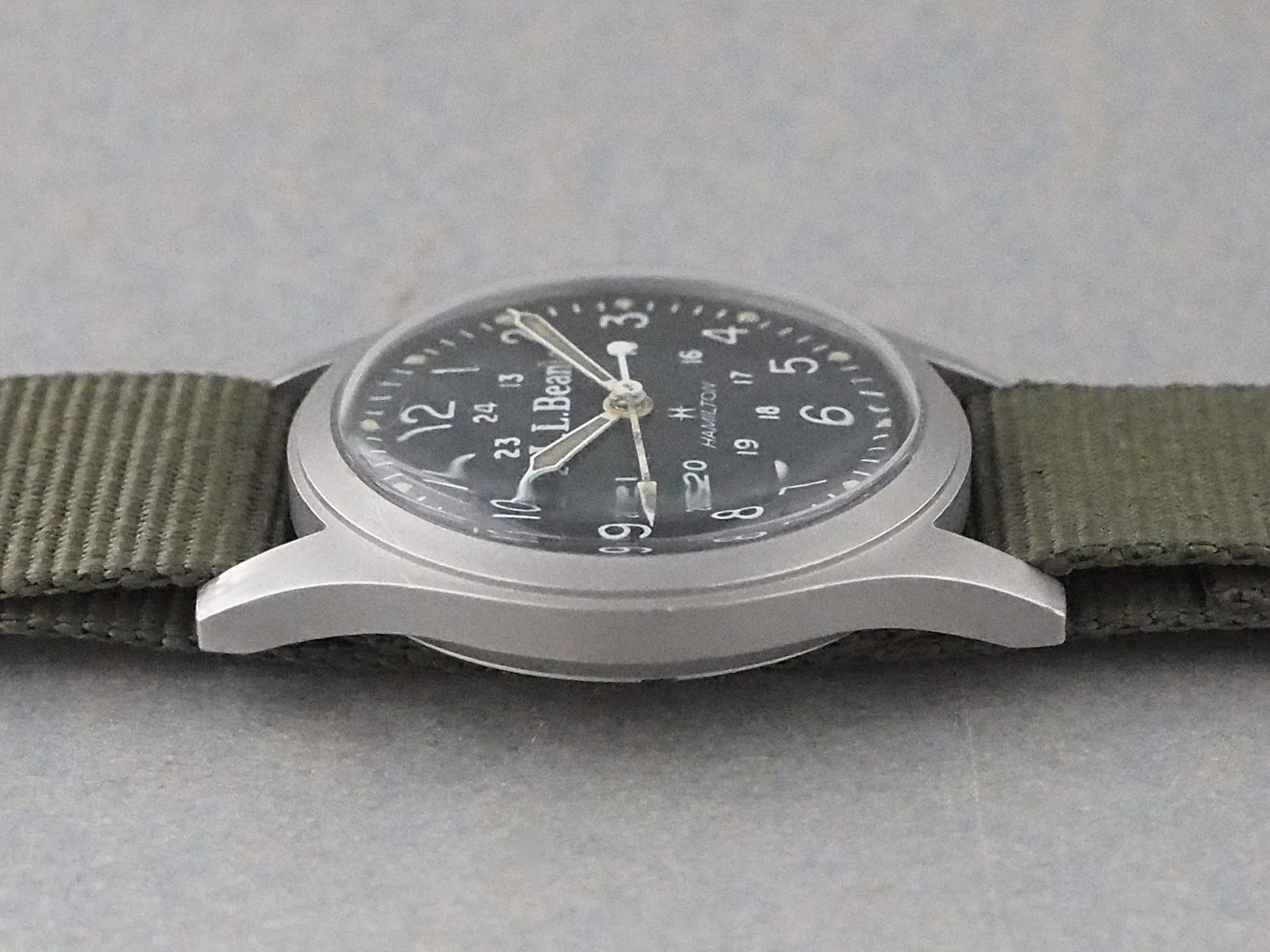 現在まで様々なバリエーションが存在しますが、当初は手巻き式でケースサイズはミルスペック仕様と同じ33mmでした。また、企業とのコラボモデルも存在し、こちらは『L.L.Bean(エルエルビーン)』とのWネームです。