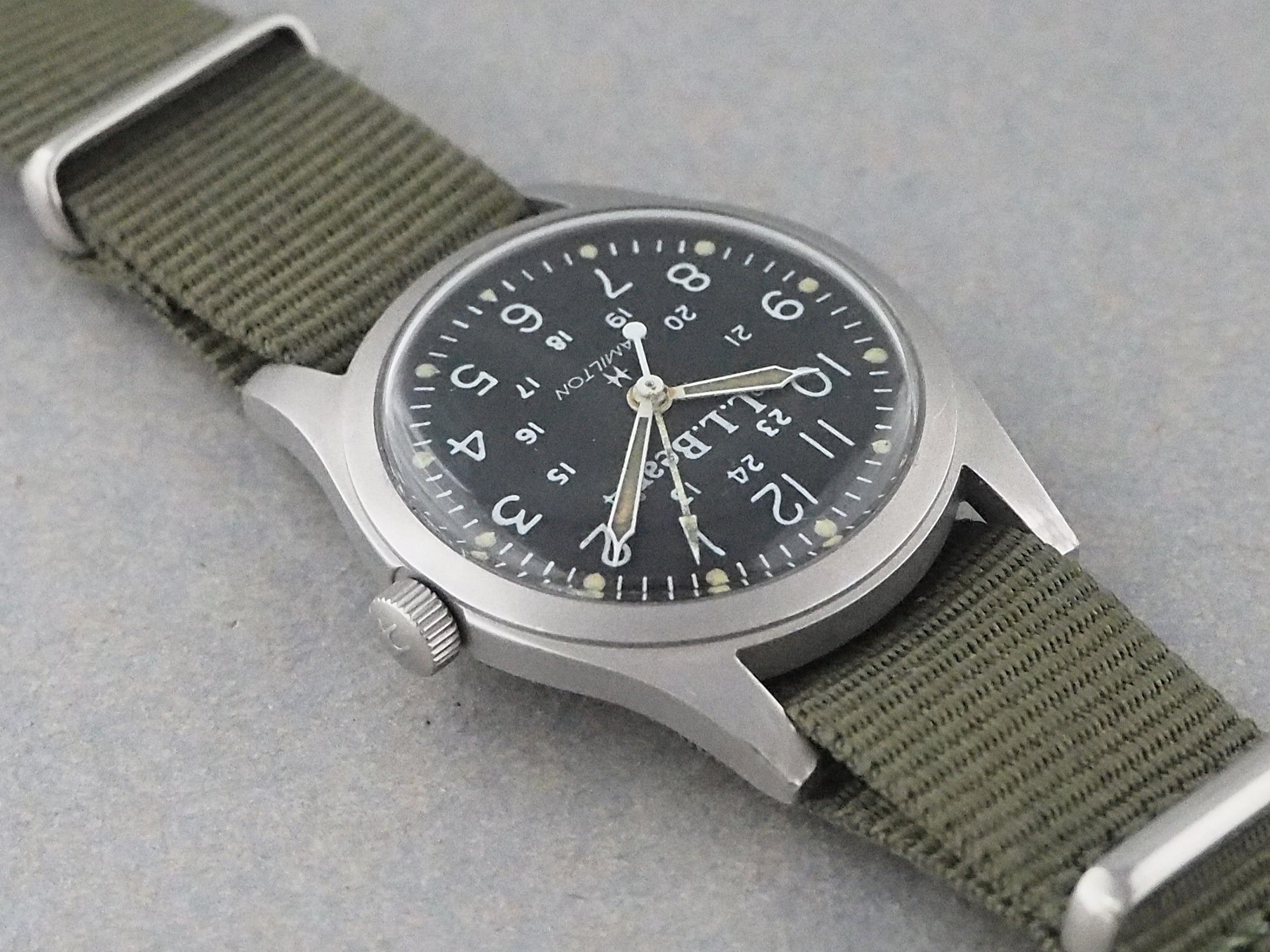 針や夜光塗料に多少の劣化がみられるものの、ミリタリースタイルの時計としては少し使い込まれた雰囲気も魅力的です。