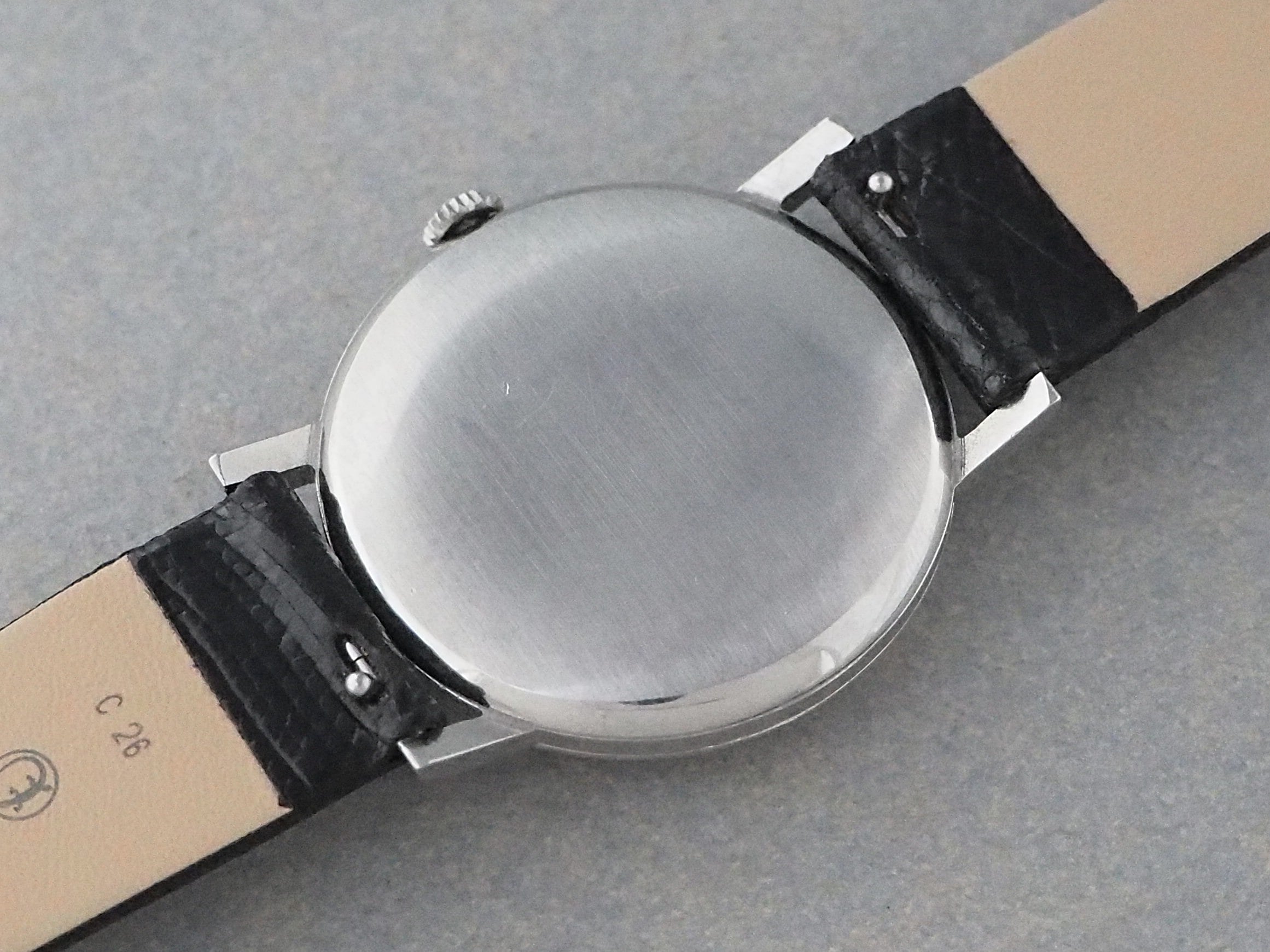 装飾的なディテールを省いたケースは、わずかな小キズのみで全体的に良好なコンディションです。文字盤と相まって、時計全体に洗練された印象をもたらしています。