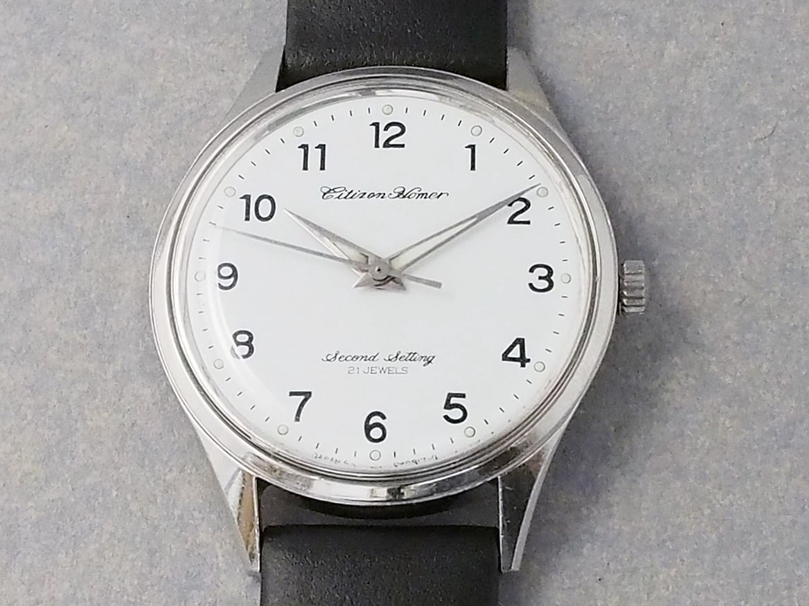 鉄道時計として使われていただけに、市販モデルのホーマーよりも石数を多く使用し、針は夜光仕様、さらには秒針停止機能を備えるなど機能性も十分です。