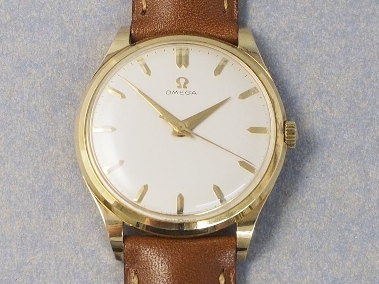 文字盤は艶のあるほぼ白に見えるシルバーで、50~60年代前半のオメガによく見られる砲弾型インデックス、これもこの年代に見られることが多いドーフィン型の長短針の組み合わせによってビンテージ時計の良さに気づきます。