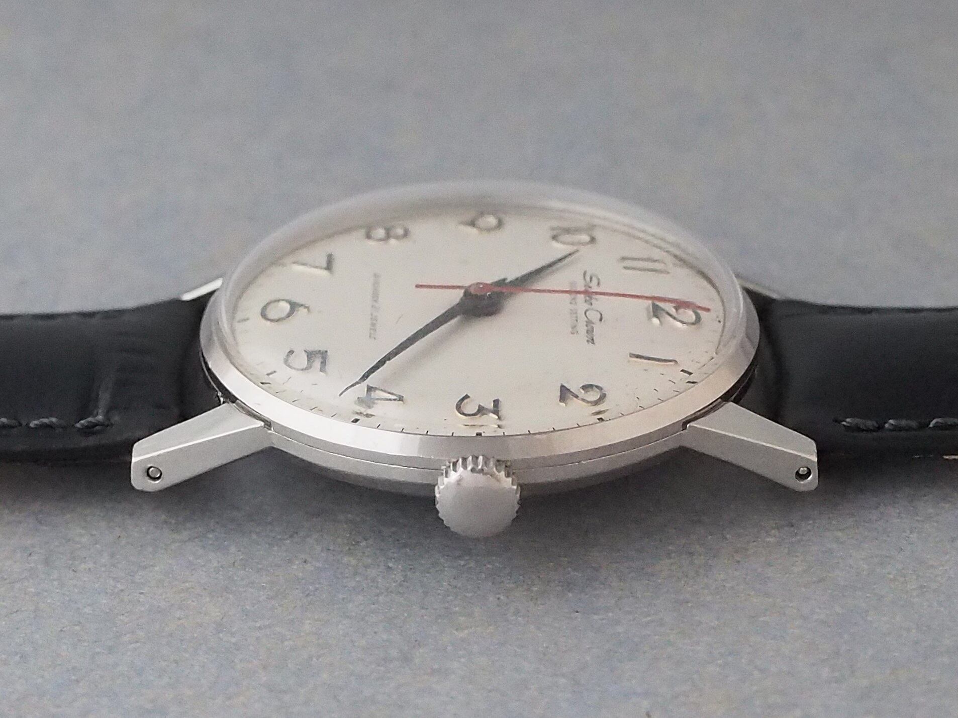 文字盤にダメージが見られる個体も多いモデルですが、この時計は比較的良好な状態です。高い視認性を確保するため秒針は赤く、長短針は黒にカラーリングされインデックスは全数字となっています。